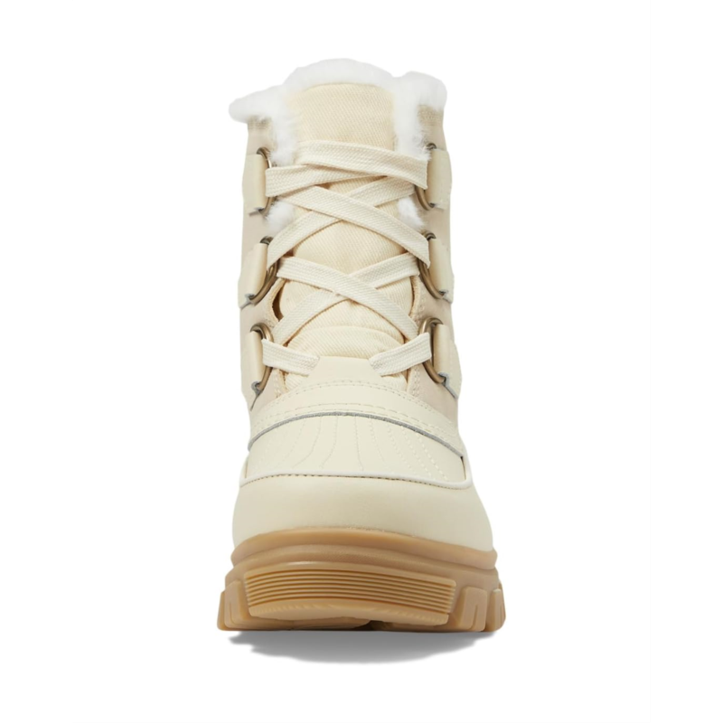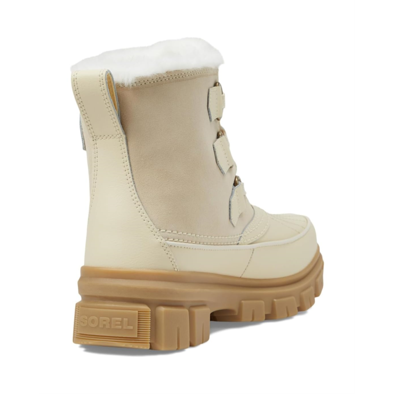 - Winter weather is no match for the SOREL Tivoli V Waterproof snow boots. Getting out and about is made easier thanks to the premium winterproof details and OutDry waterproof construction. Crafted from waterproof suede upper with PU coated leather mudguard and heel overlay. Features canvas tongue, faux fur collar with microfleece lining, removable plush PU-like EVA footbed with microfleece topcover, internal EVA drop-in pods, and molded rubber outsole. These mid-calf length flat heel boots feature round toe silhouette and lace-up closure. Laces are not waterproof.