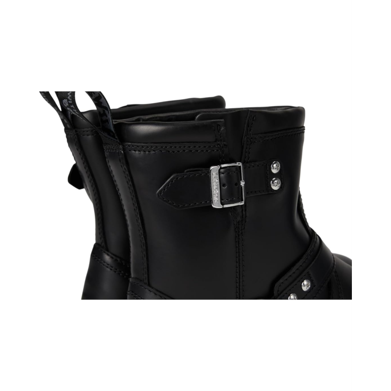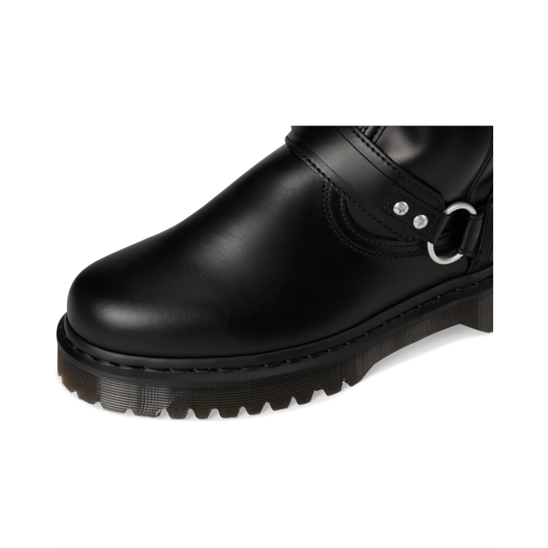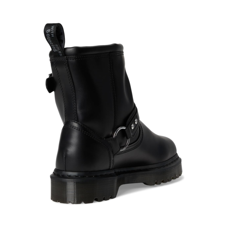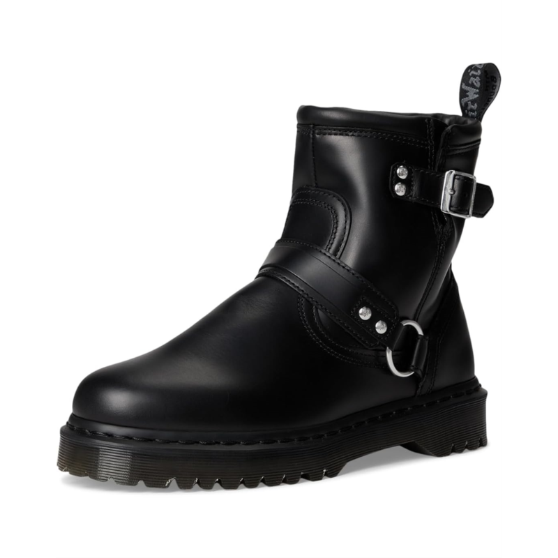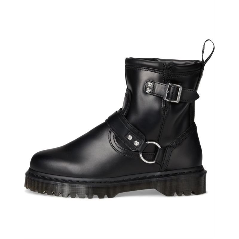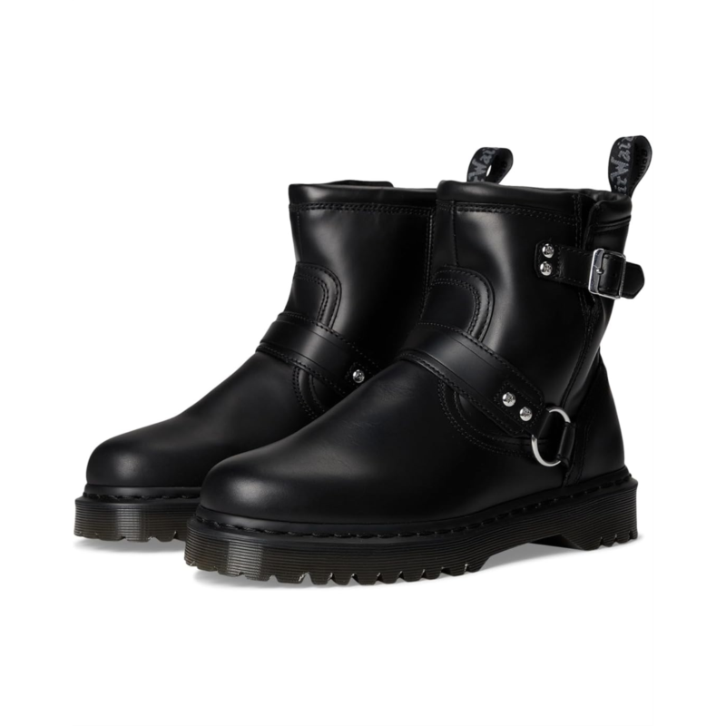 - Low-built but high-impact. The Dr. Martens Anistone Harness biker boot is a collision of practical utility and standout aesthetics. Crafted in Crazy Horse leather for a rugged finish that ingrains deeper with wear. The silhouette is wrapped in a harness and added a buckle on the side, both in antique brass. The scripted heel loop and yellow welt stitching give the boot a recognizably DM''s stamp, while the trans Bex sole delivers a little extra height.