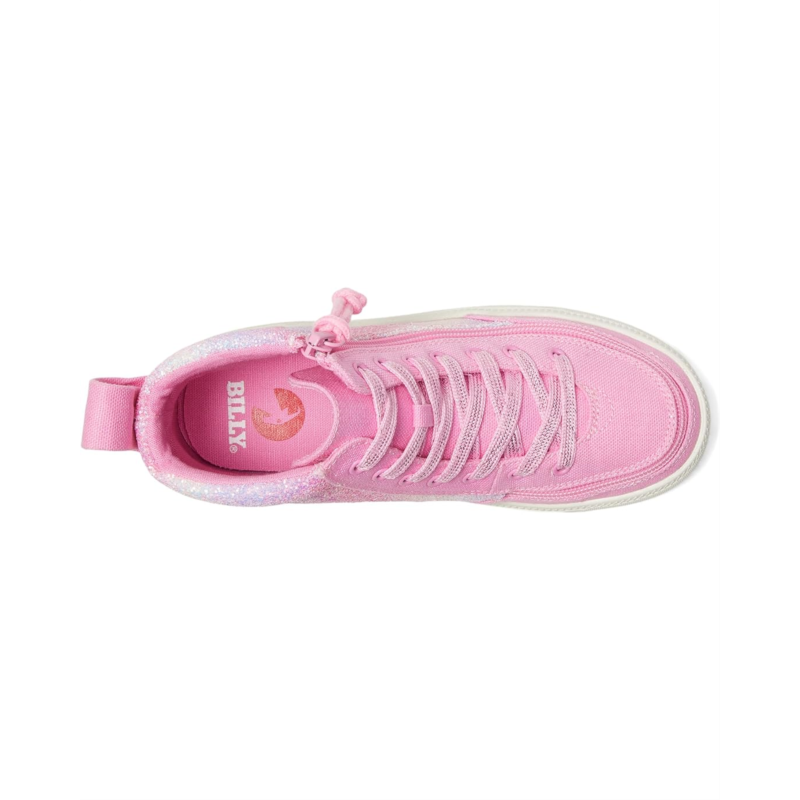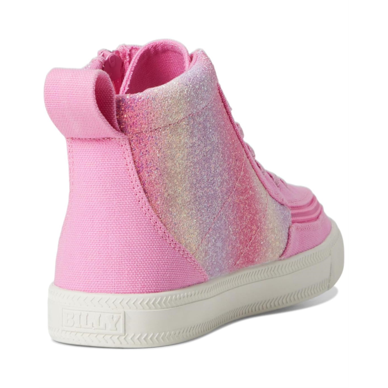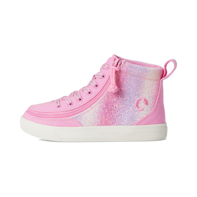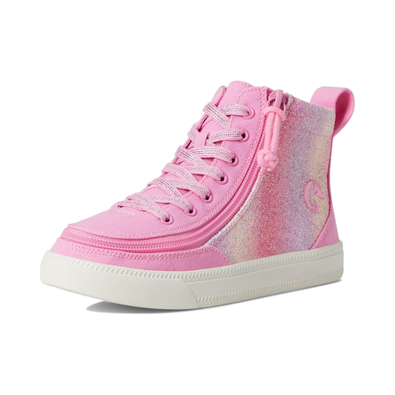 - The BILLY Footwear Kids BILLY Classic Lace High provides optimal fit, comfort, and support! This eye-catching kids'' shoe features an iridescent glitter textile and canvas upper in a chic ombre color. With cotton lining, flat and removable rubber insole, and foam midsole, these shoes are as comfortable as they are stylish. The zippered wrap closure and adjustable laces ensure a perfect, customized fit for all-day comfort.