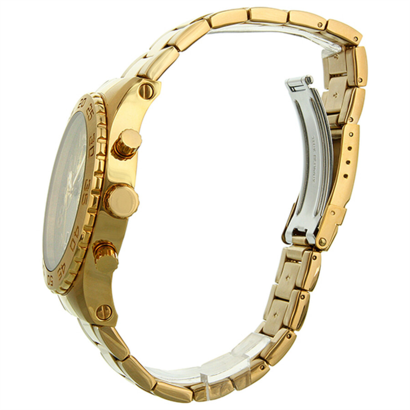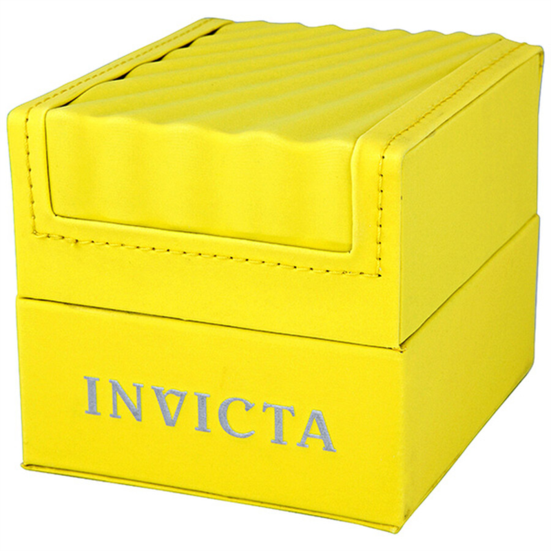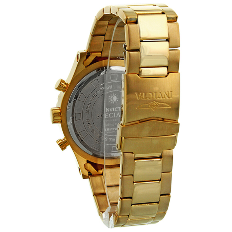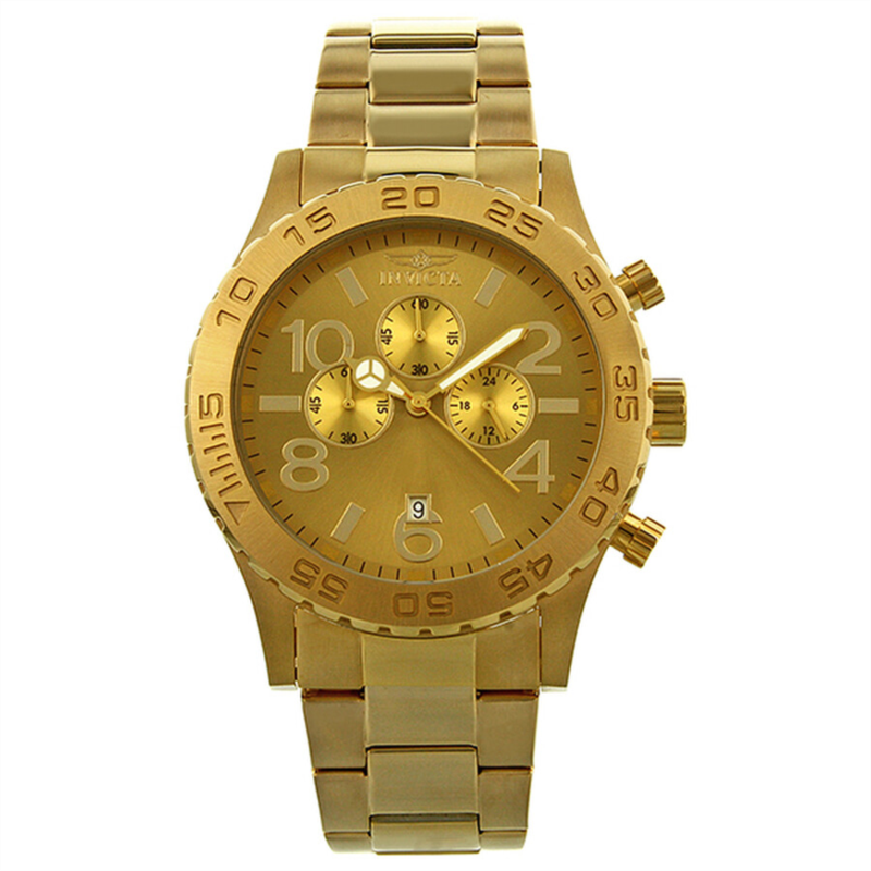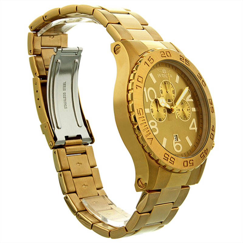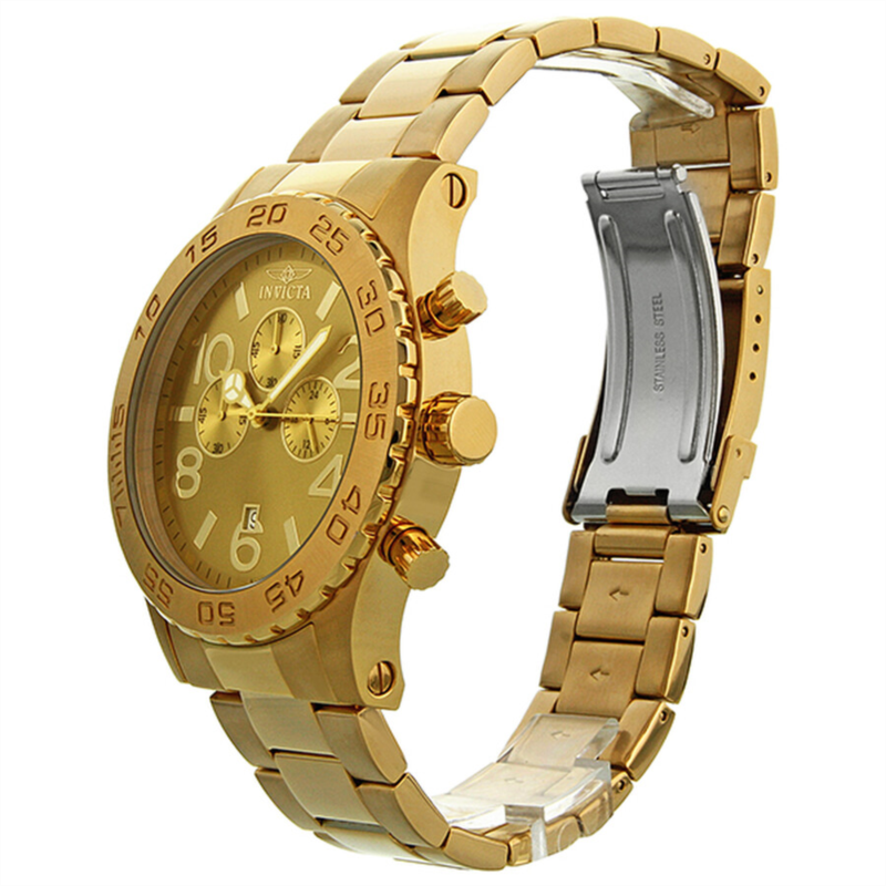 Yellow gold-tone stainless steel case and bracelet. Unidirectional yellow gold-tone bezel. Champagne dial with luminous hands and alternating Arabic numeral and index hour markers. Minute markers around the outer rim. Date display appears at the 6 o''clock position. Chronograph - three sub-dials displaying: 24 hours, 60 minutes and 60 seconds. Quartz movement. Scratch resistant flame fusion crystal. Solid case back. Case diameter: 50 mm. Case thickness: 13 mm. Bracelet width: 26 mm. Deployment clasp with safety release. Water resistant at 50 meters/ 165 feet. Functions: hours, minutes, seconds, chronograph, calendar. Invicta Elegant Ocean Champagne Dial Men''s Watch 1270.