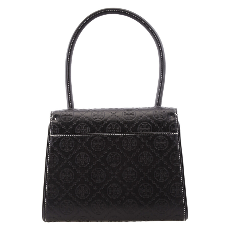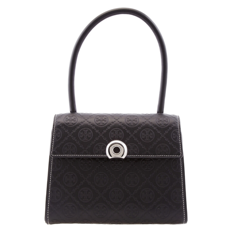 Tory Burch Ladies Shoulder Bag. SKU: 164307-001. Color: Black. Tory Burch Small Deville Bag. Crafted from premium leather by an LWG-certified tannery, the Small Deville Bag features a structured silhouette with Double T debossing, sculptural hardware, and a top handle. Compact yet functional, it includes multiple interior and exterior pockets and a turn-lock flap closure. Dimensions: 8.9'' L x 6.9'' H x 3.2'' D Handle Drop: 6.7'' Material: Leather with napa lining.