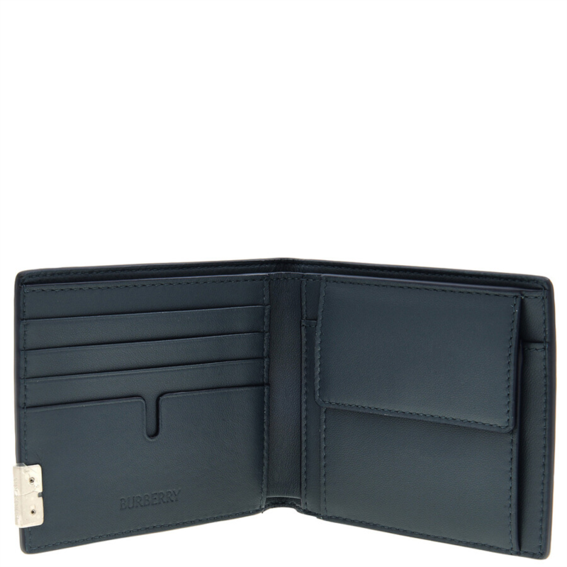 Burberry Mens Wallets. SKU: 8089532. Barcode: 5045706380372. Color: Lake. Size: 4.3 x 3.7in. Burberry B Cut Bifold Coin Wallet. Crafted from Italian-tanned grainy leather, this wallet features multiple card slots, a bi-fold design, and B-cut hardware engraved with the Burberry logo. 100% calf leather.