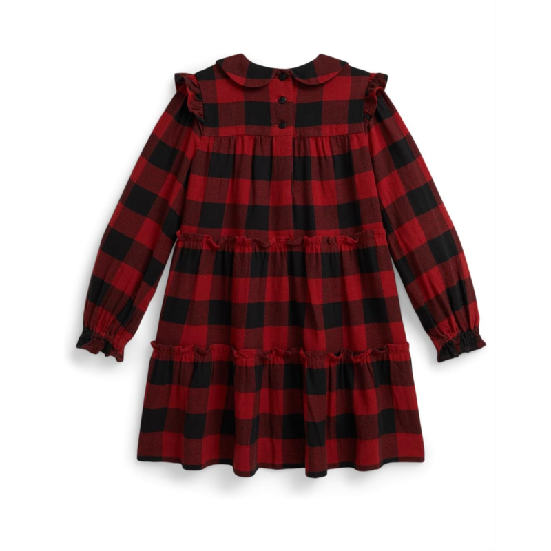 - This Polo Ralph Lauren Kids cotton twill dress is designed with ruffle trim and a bold buffalo check motif, making it a festive pick for the season. Crafted in a charming A-line silhouette, it features a sweet Peter Pan collar and a buttoned placket at the back neck for easy wear. Long sleeves with elasticized cuffs finished with delicate ruffle trim add a touch of softness, while ruffle detailing at each shoulder enhances its playful appeal. The skirt is designed with three shirred tiers, with additional ruffle trim along the bottom two tiers for extra movement and flair. Completing the look, the signature ''Polo'' embroidery at the right hem lends a refined finishing touch.