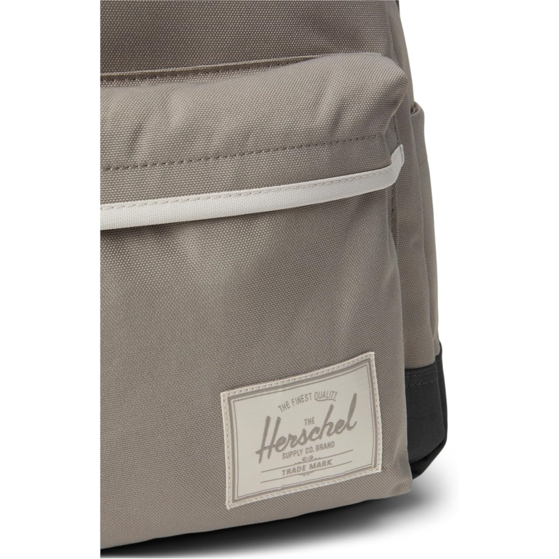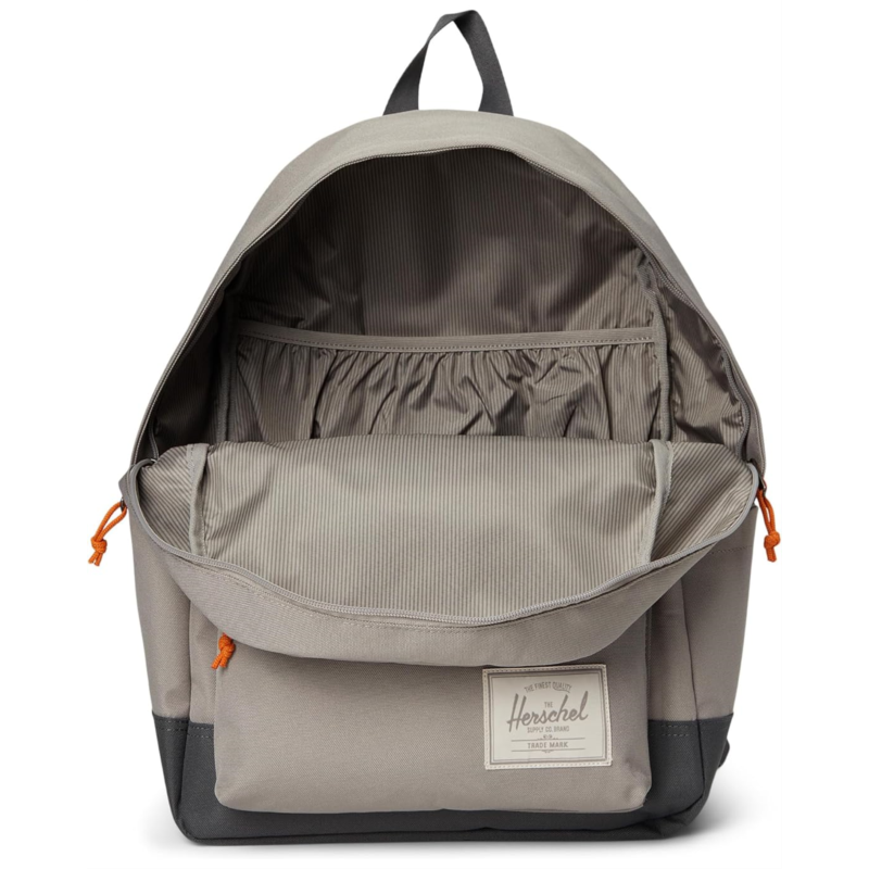- The Herschel Supply Co. Herschel Classic Backpack keeps things simple while being truly functional. Made from 100% recycled 600D polyester, its built for everyday use with a spacious 26L capacity and a clean silhouette. Inside, a floating sleeve protects 13/14 laptops, while the tonal stripe liner adds a subtle signature touch. Zippered closures with Prusik cord pulls, an exterior zippered pocket, and a water bottle pocket offer practical storage, and padded adjustable straps ensure a comfortable carry.
