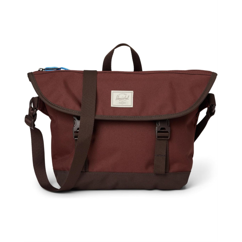 - Go where adventure calls carrying the Herschel Supply Co. Cove Small Messenger. Crafted from post consumer recycled PET with TPE coating, this bag features buckled closure, zippered top lid pocket with key clip, smooth webbing strap adjusts for comfortable hands-free journeys, front straps with buckle fastening, and internal organizer pockets.