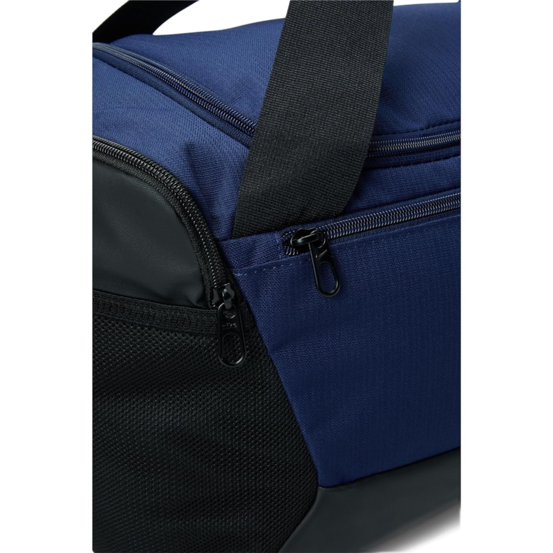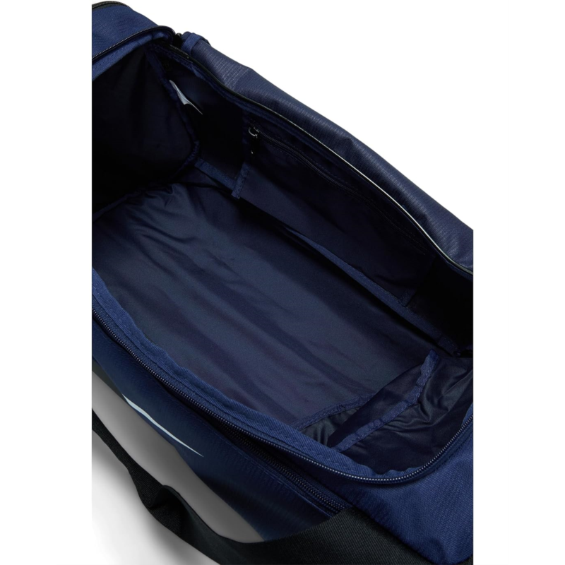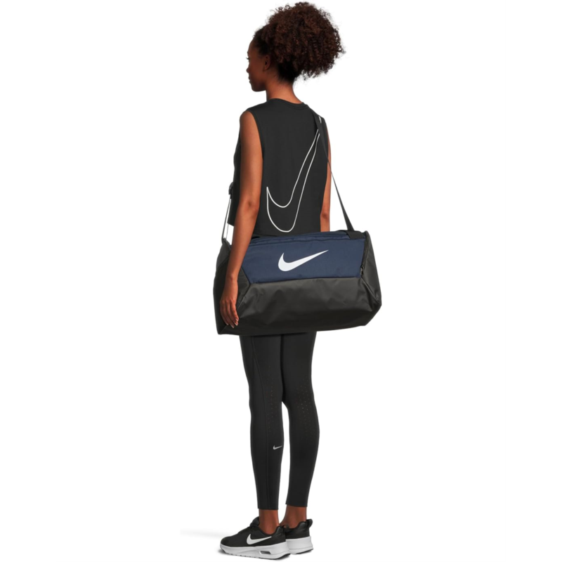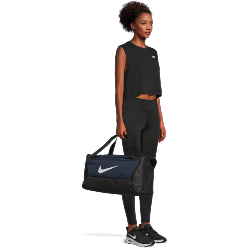 - Hit the gym carrying the Nike Brasilia Training Duffel Bag (Small, 41L), made to hold all your gear. The ventilated side compartment separates your smelly shoes from your post-sweat-sesh clothes. Get quick access to your phone or keys with the zippered front pocket when youre on the go. Toss it in your locker, next to the power rack, and, when youre done, in your car-the coated bottom helps shield your things from bumps and spills.
