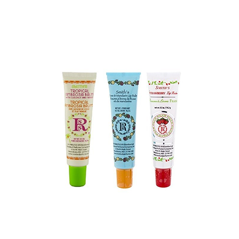 [US] Rosebud Perfume Co. Tube 3 Pack: Tropical Ambrosia Balm Rose & Mandarin Lip Balm Strawberry Lip Balm