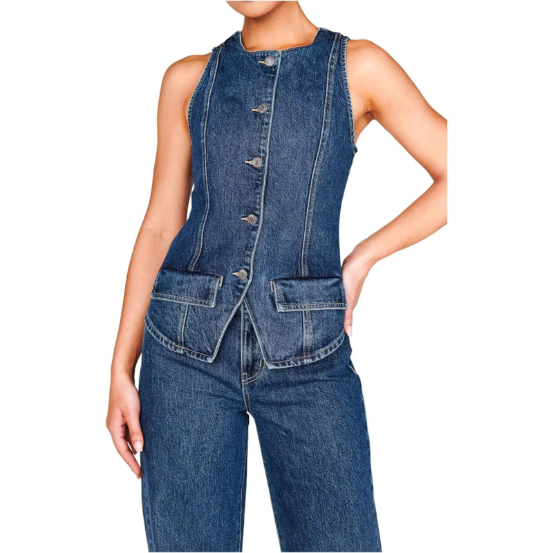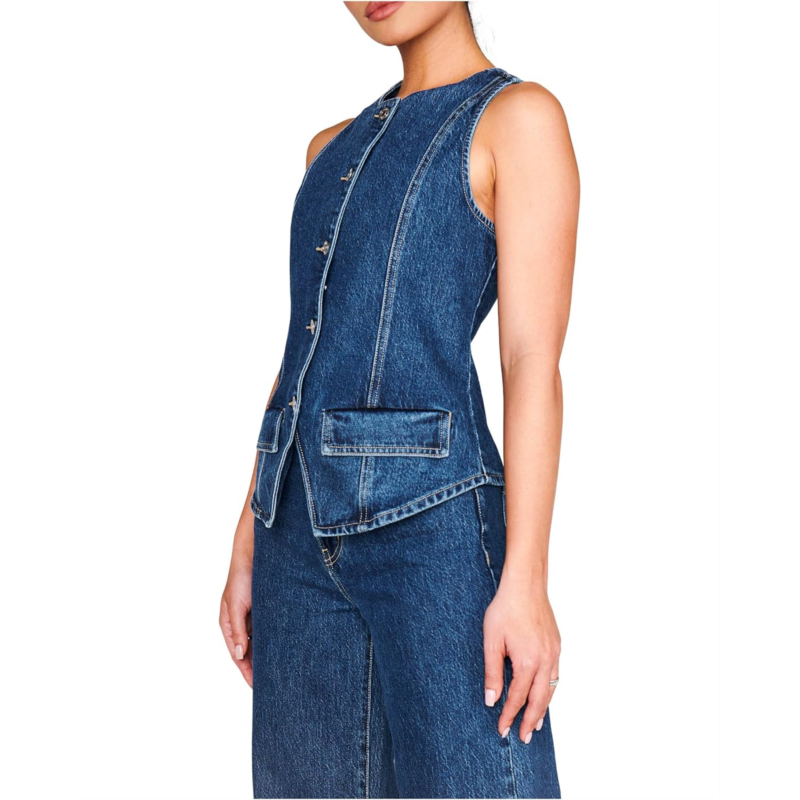 The Show Me Your Mumu Midland Vest Top is a versatile piece featuring a structured silhouette, buttoned front closure and high neckline for a poised look. Two front flaps are designed to add a dynamic flair.