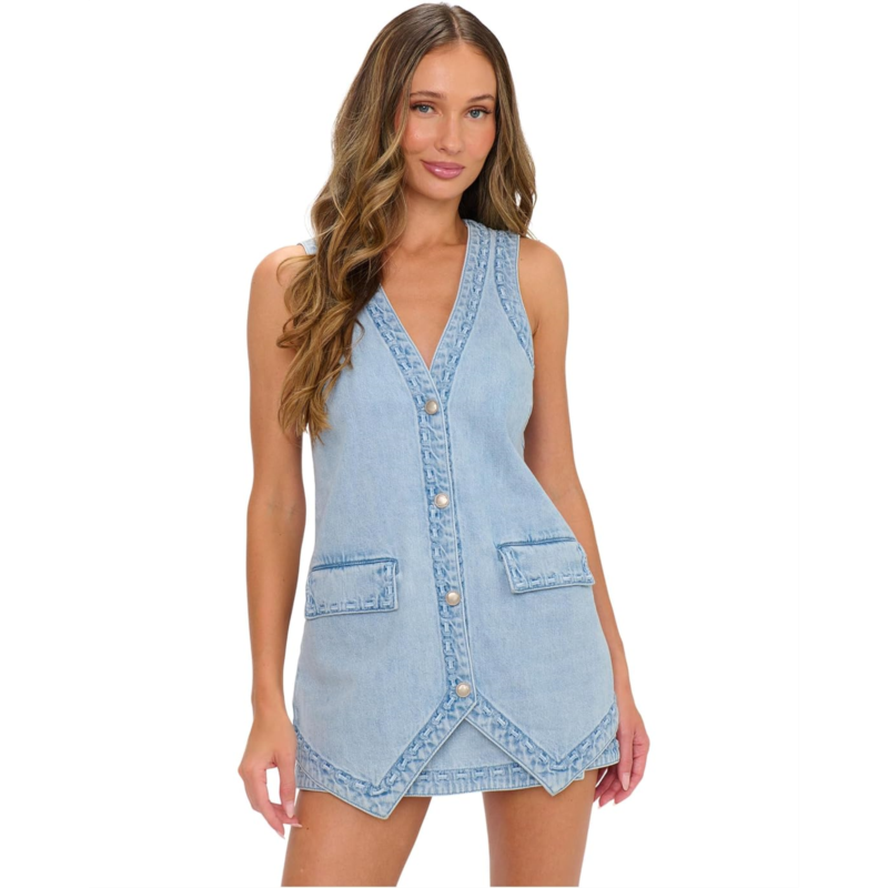Show Me Your Mumu Wyatt Vest pairs back to your favorite denim or with our matching Wyatt Wrap Mini Skort. Soft light denim with gold buttons in a long line fit. Has a fun contrast hem detail!