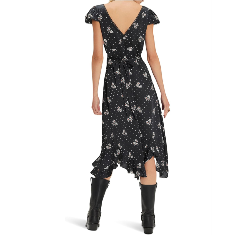 - Slip into this romantic midi dress featuring a satin fabrication with a flowy empire waist, sweet embroidered details, and an adjustable back tie for the perfect fit. Short cap sleeves. Fabric-covered buttons. Lace and ruffle detailing. Plunging back.