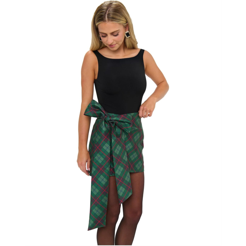 - Holiday chic meets flirty fun! The Show Me Your Mumu Iva Bow Skirt features festive green plaid with an adorable tie-front detail and asymmetrical hem. Perfect for pairing with your favorite tank or blouse - this mid-rise skirt brings the perfect amount of preppy-meets-party vibes to any occasion!