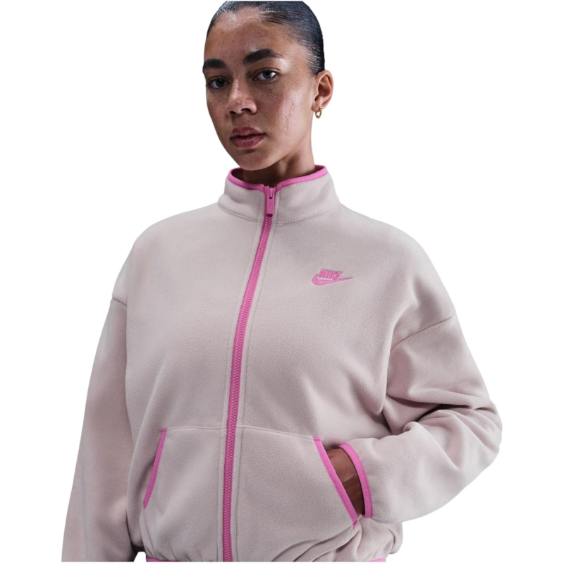 - Layer up in this cozy Nike Sportswear Club Fleece Loose Cozy Track Jacket. Lightweight fleece is brushed on both sides for all-around fuzzy comfort while the loose fit makes this an easy layer to throw on. Made from polyester, it features a zippered front closure for easy wear. This zip-up anorak jacket is styled with long sleeves, a collared neckline, an embroidered Futura logo, and a straight hem.