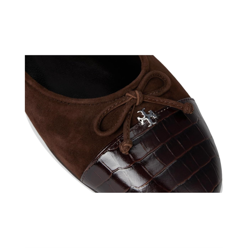 - Tory Burch Cap-Toe Ballets are as comfortable as eye-catching. The style of these classic flats is defined by a sleek and contrasting cap toe with a bow-tie accent and an embossed iconic logo. The leather upper and lining coupled with a cushioned footbed account for the comfort of this footwear.