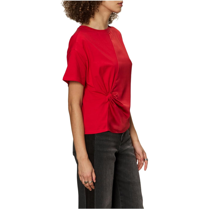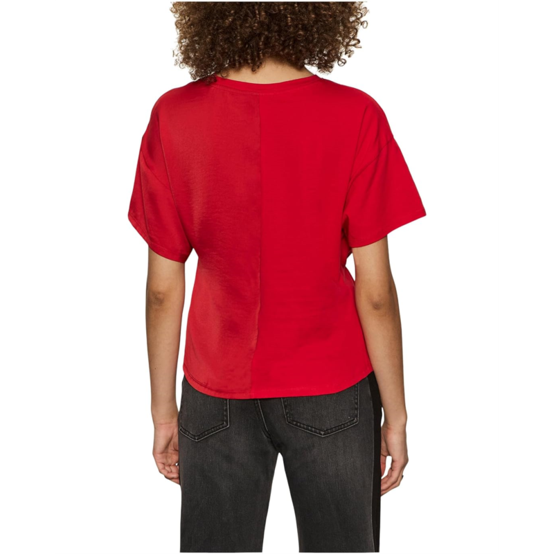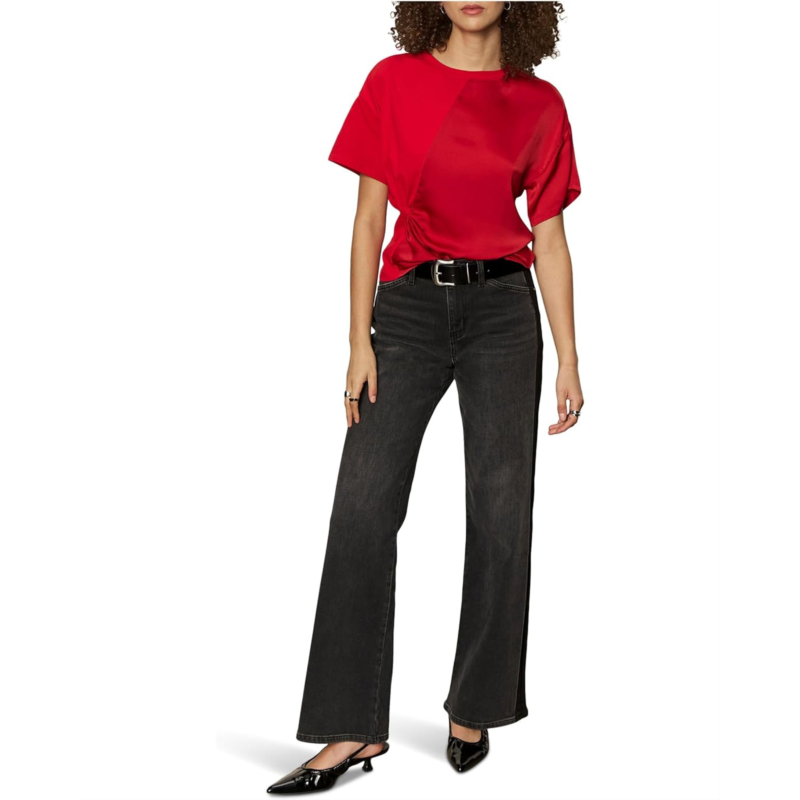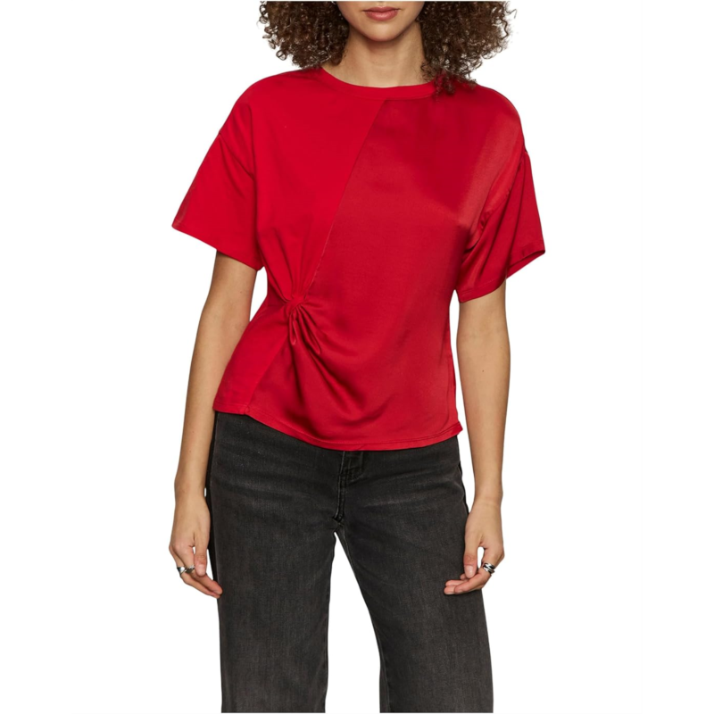 - Get ready to upgrade your everyday style choosing the Sanctuary Satin Mix Tee! This must-have piece features a classic crew neckline and short sleeves, perfect for all-day comfort. Plus, the knot detail on the front adds a trendy touch, while the straight hem gives it a clean finish.