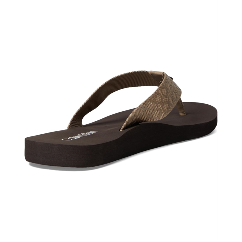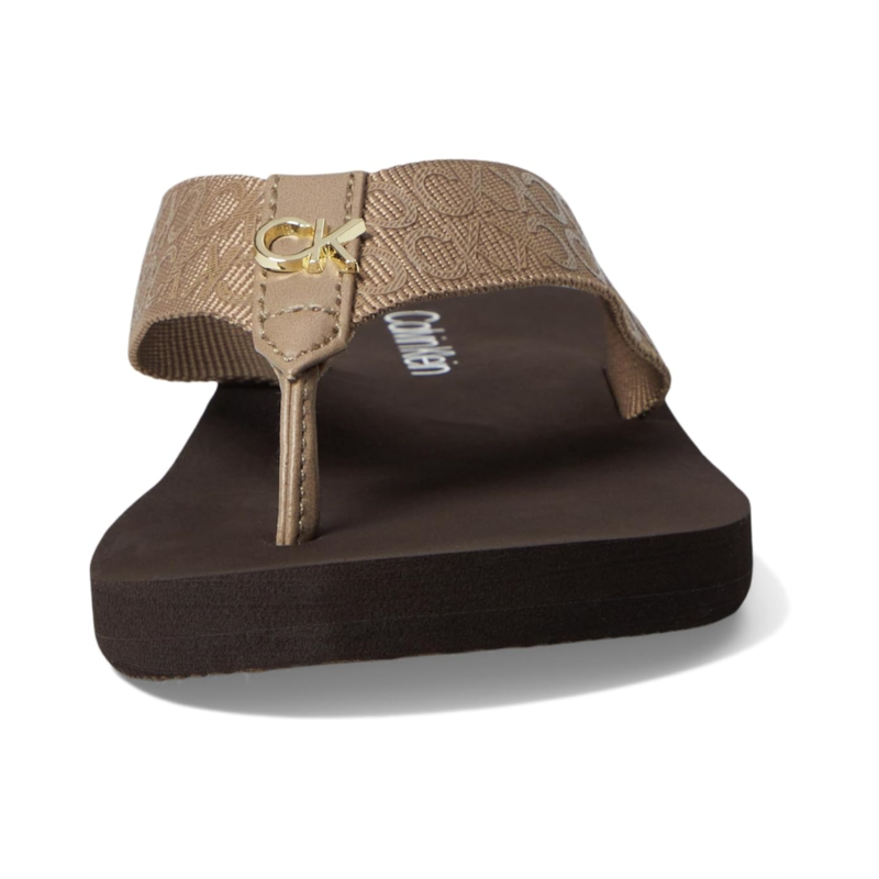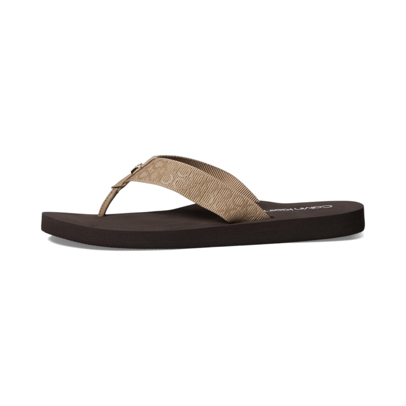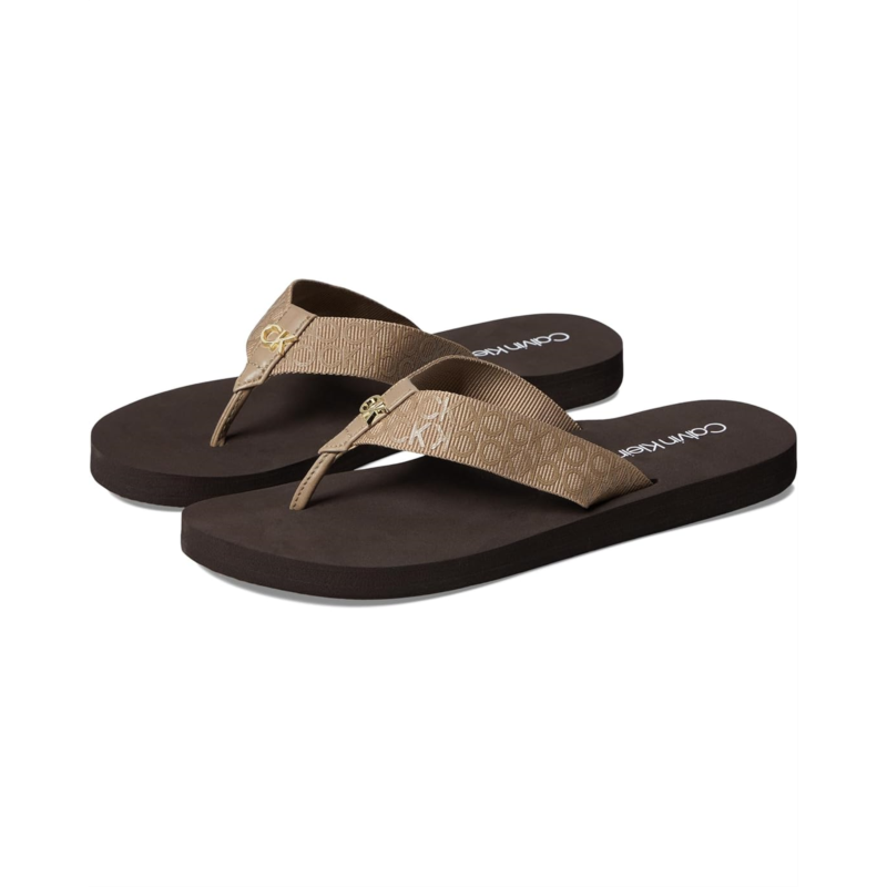 - From casual days at the beach to fancy soirees wear the Calvin Klein Caluha. These sandals feature repetitive brand detailing on the strap, open round toe design, and slip-on construcrtion. It has a textile and man-made upper.