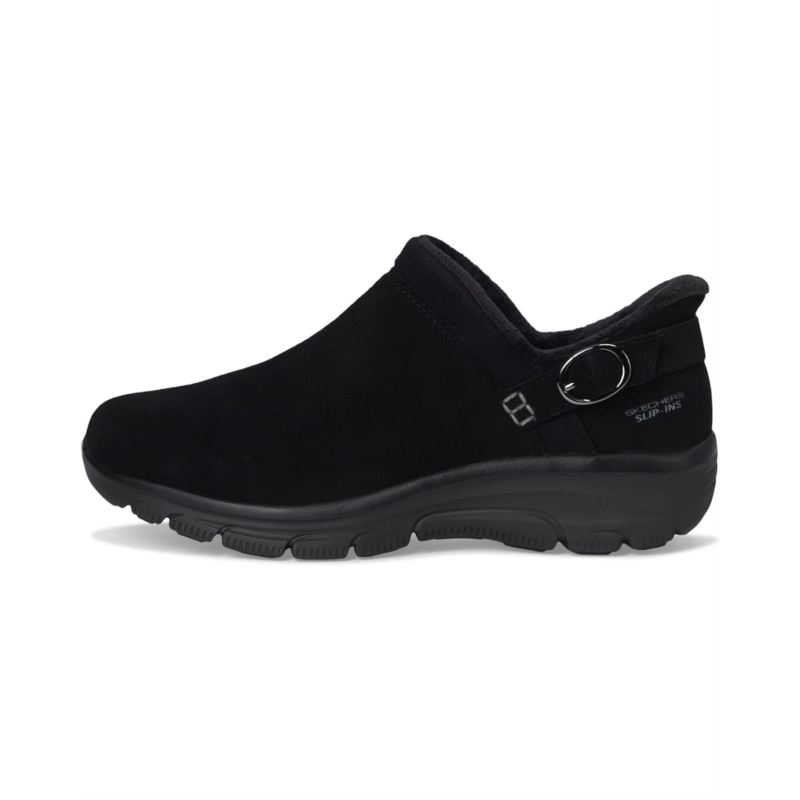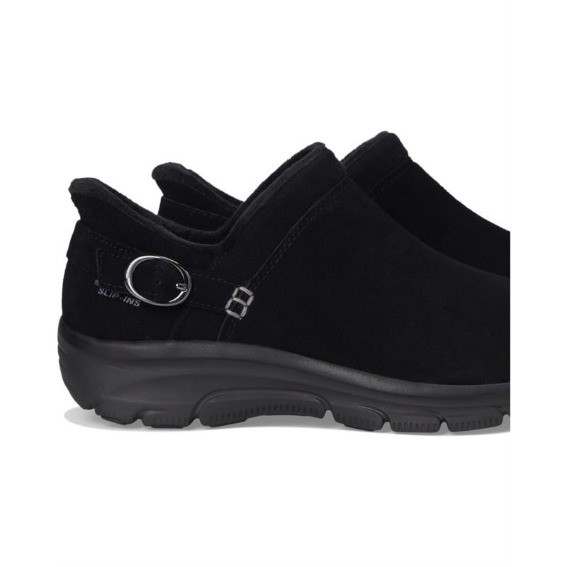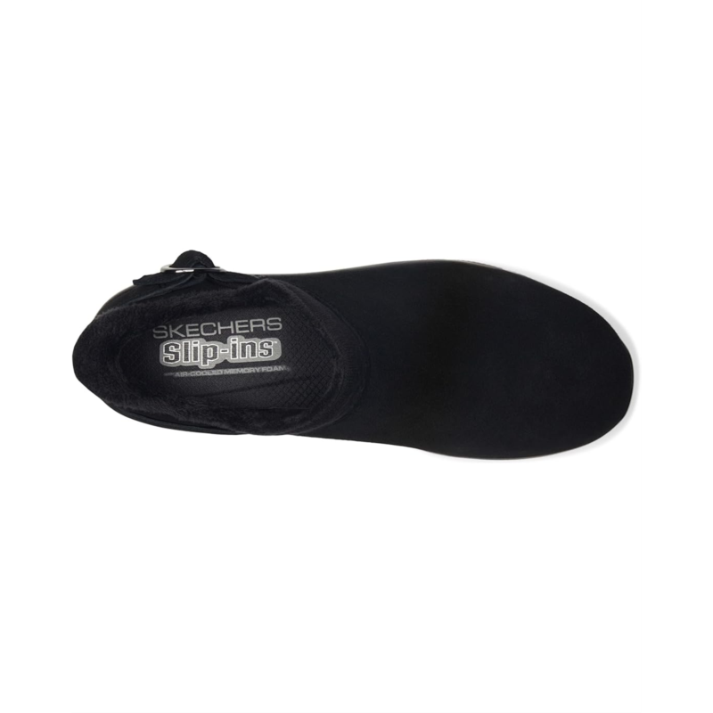 - Get into the season with effortless cozy comfort wearing SKECHERS Hands Free Slip-ins Relaxed Fit: easy going - modern time. Designed with the exclusive Heel Pillow, this buckle detailed fashion bootie features a 3M Scotchgard treated vegan leather upper with faux fur lining and a cushioned SKECHERS Air-cooled Memory Foam insole.
