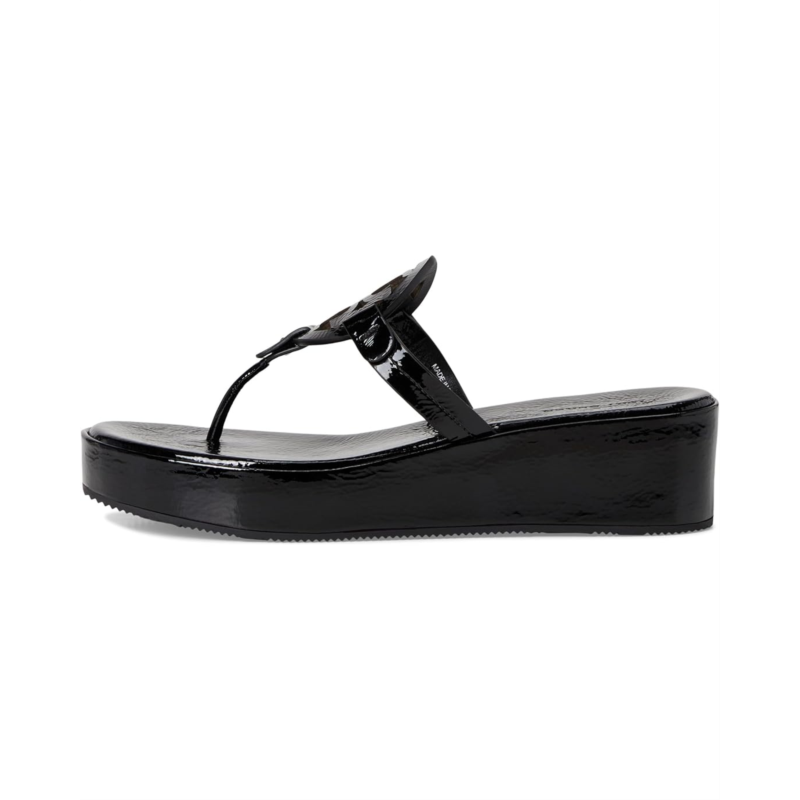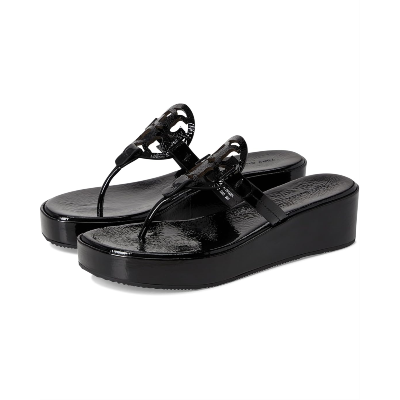 - Perfect to pair with your party outfits and styles, the Tory Burch Miller Wedge 25Mm sandals work for different occasions. These heeled sandals are made of a leather insole and lining. The leather upper is styled with a cut-out brand detail. Comfortable and chic, these slip-on heels are a must-have for your footwear collection.