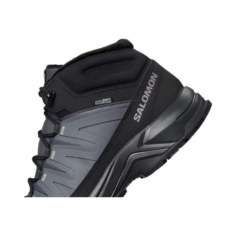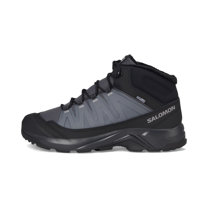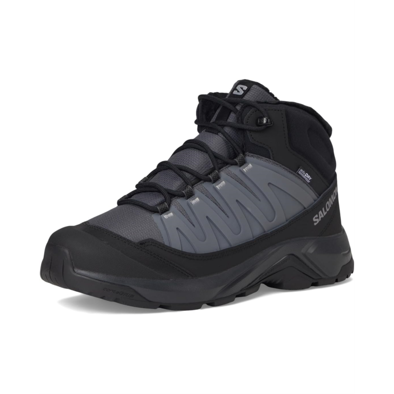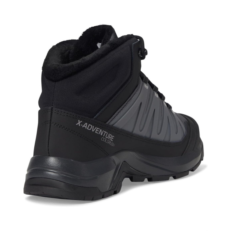 - The Salomon X-Adventure shoes are climbing shoes that tick all the boxes. Featuring trademark insulation and waterproof membrane, you''ll stay warm and dry around town or while having fun in the ski resort. Their Contagrip technology with aggressive lug design ensures grip on all surfaces and terrain types, while the solid foot support will keep you firmly on your feet in the snow. These mid-top shoes are made of a leather upper, polyester insole, and polyester lining. Offering durable grip and support along with cold-weather protection, these lace-up shoes will keep your feet warm and dry.
