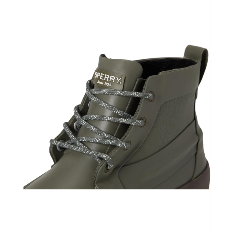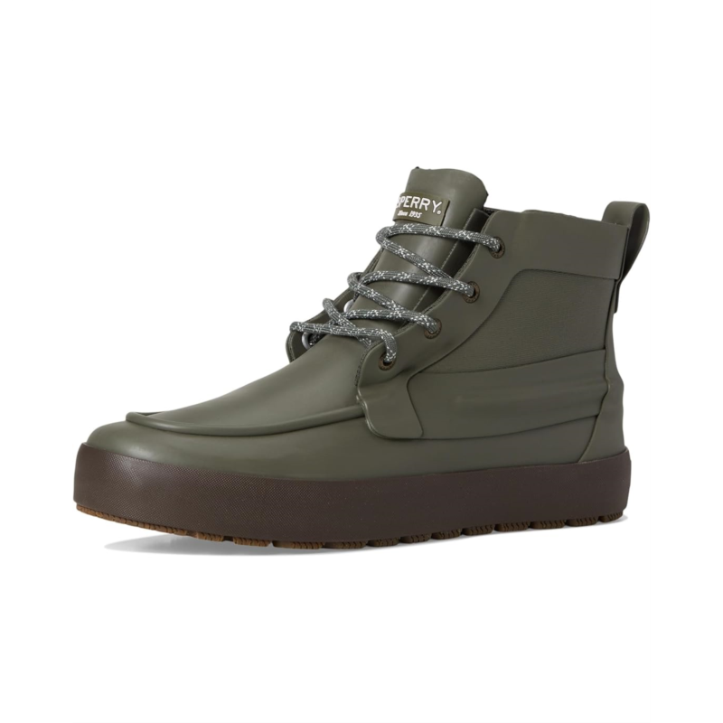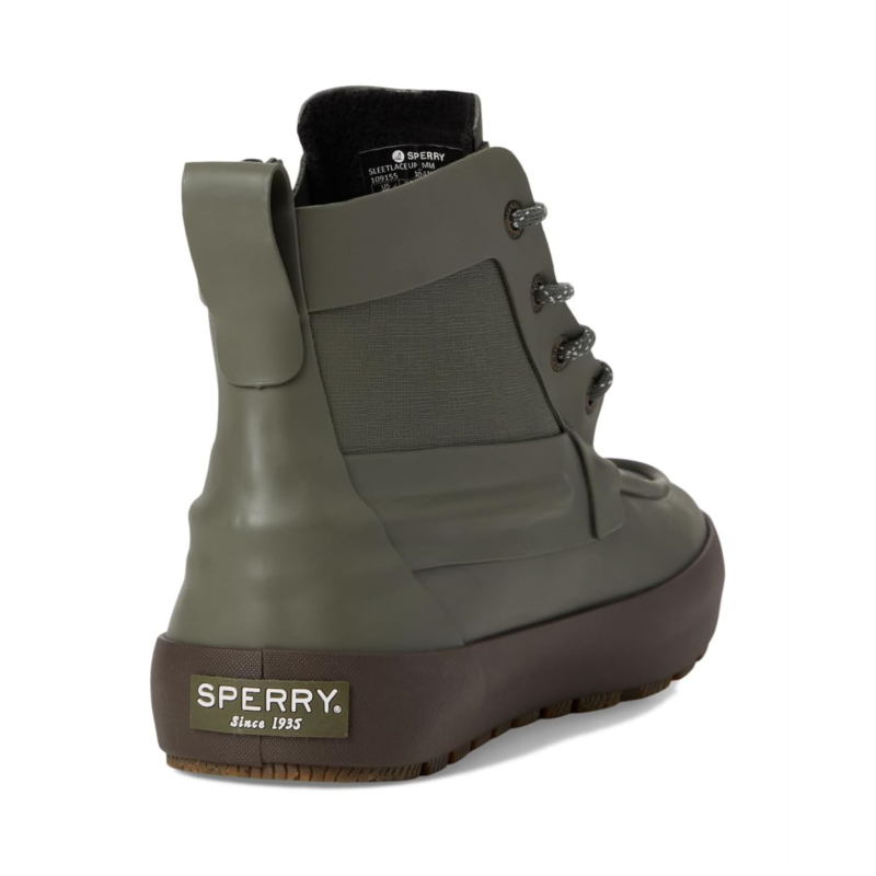 - Slushy, wet weathers got nothing on the Sperry Sleet Lace-up Ankle Boot. This waterproof, vulcanized rubber rain boot is flock-lined to keep your feet dry and toasty warm throughout the colder months. With sleek boat shoe details and Sperrys Wave-Siping outsole, it delivers casual style and secure footing in wet conditions.