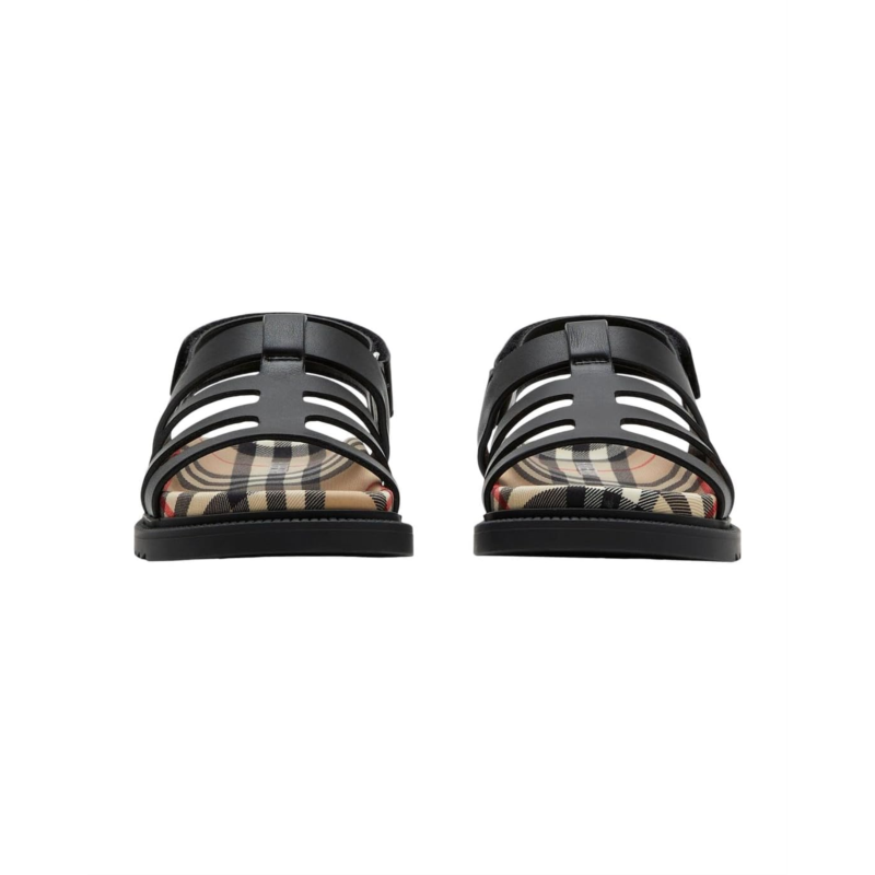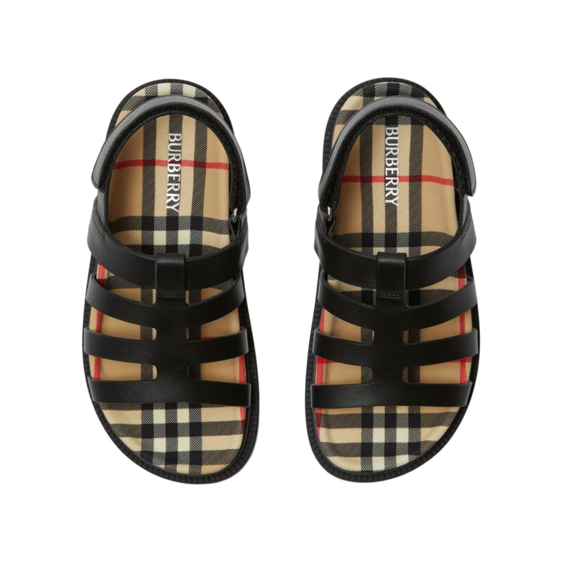 - A forever classic and iconic, the Burberry Kids Sam Sandals are designed with a gladiator-inspired strappy leather upper with an adjustable hook-and-loop closure on the back strap. The shoes have a leather lining and insole, offering your junior a premium style along with all-day comfort.