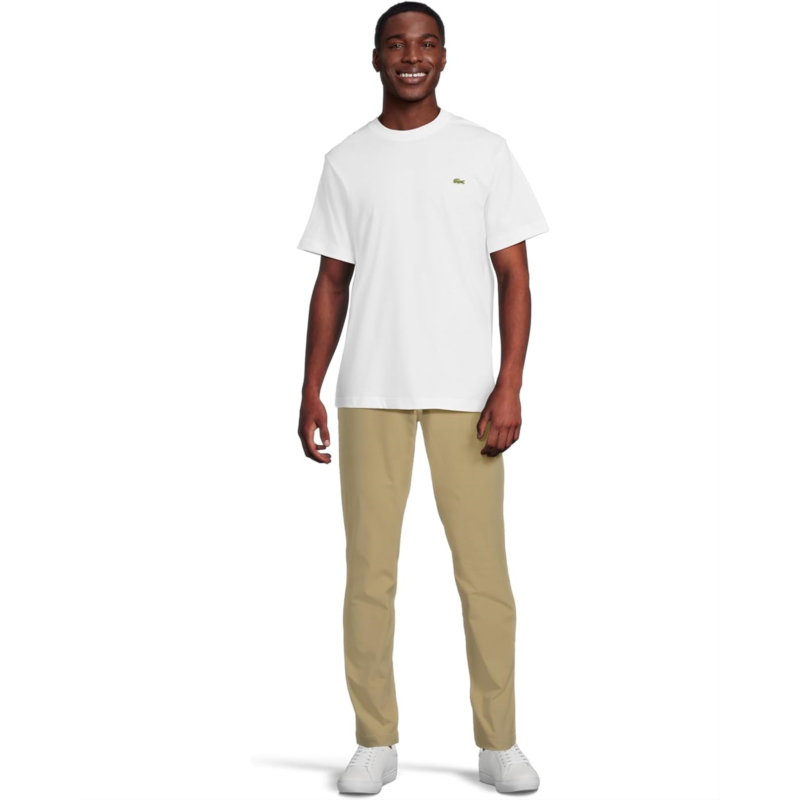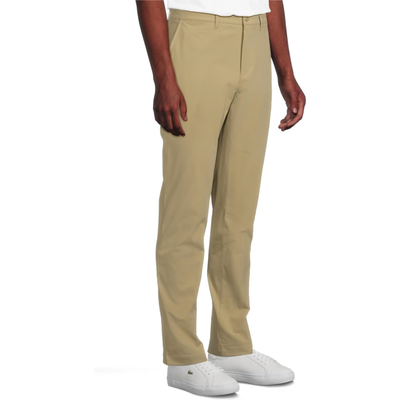 - The Lacoste Commuter Pants are designed for maximum comfort and freedom of movement. A lightweight style that is perfect for warmer days, these chino pants are crafted from stretch polyester fabric for superior comfort and durability. Designed in a straight leg silhouette, these mid-rise pants are finished with a zip-fly, tonal snap closure, and belt loops. Featuring ergonomic finish details, these pants are styled with a tonal crocodile embroidered over the back pocket.