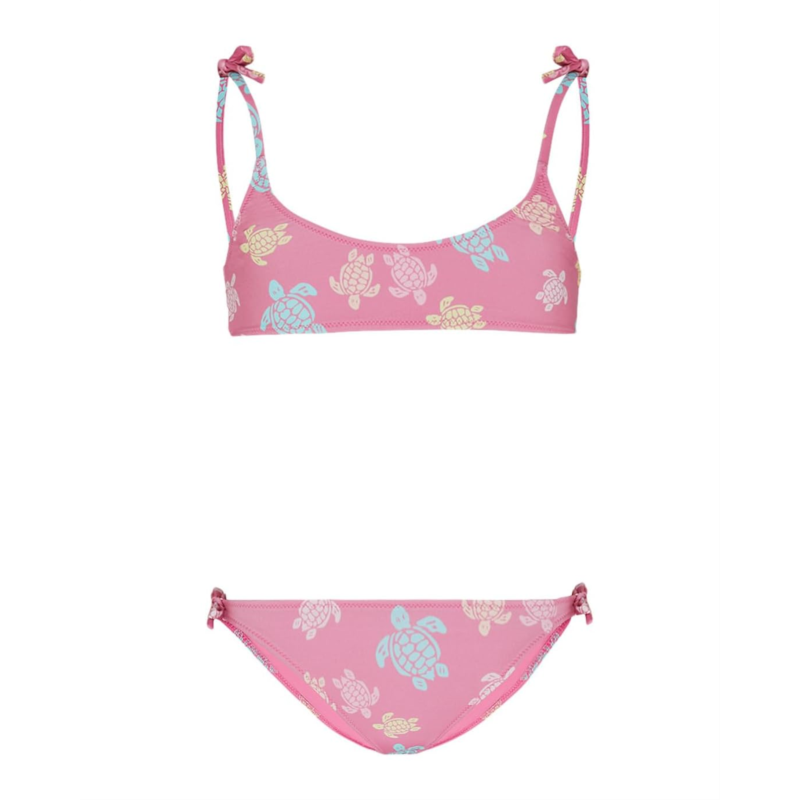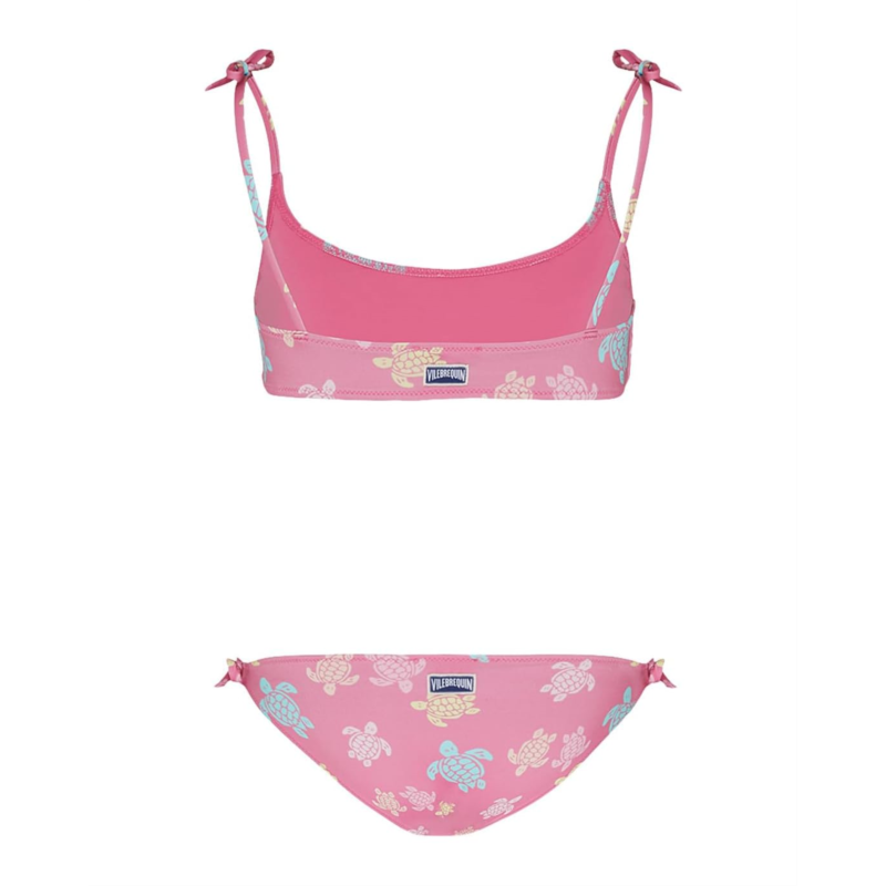 - The Vilebrequin Kids Gwendy swimwear set is a pretty two-piece swimsuit that includes a pullover bralette fashioned with convenient tie straps and pull-on bottoms with two small bows on the sides. Reflecting the soft pastels of the West Coast, the classic Tortues multicolored print adorns the fabric for an eye-catching twist. Made from jersey fabric enriched with Lurex thread for a subtle shimmer effect, this printed swimwear set is perfect to get your kid ready for the beach or a pool party.