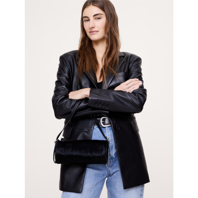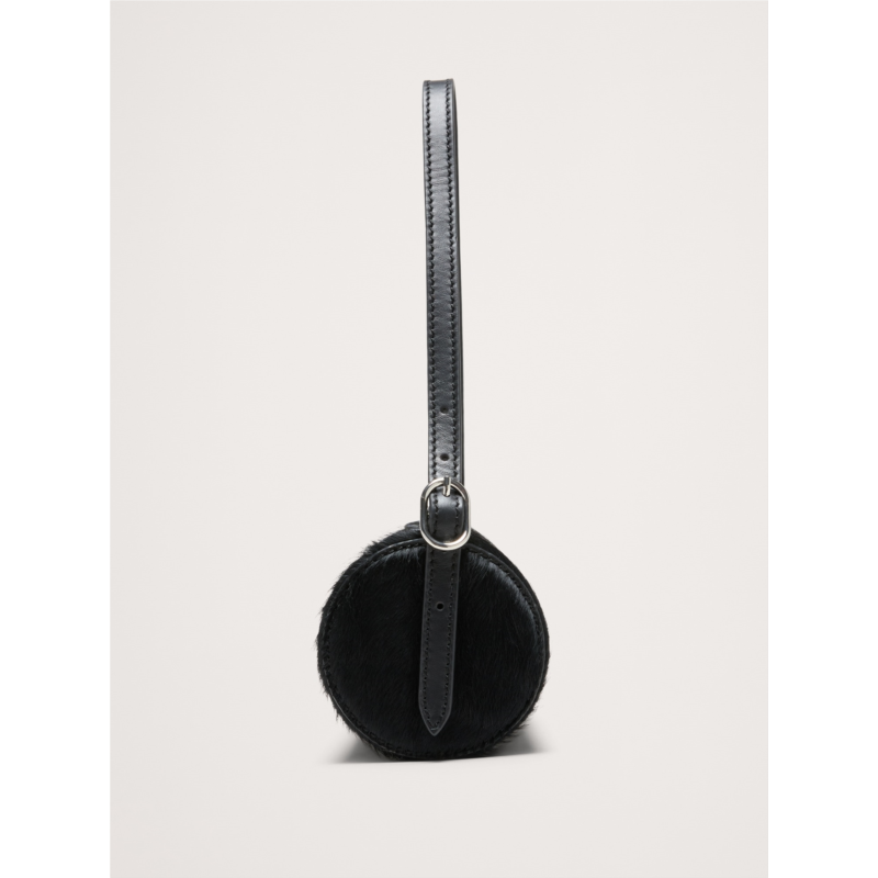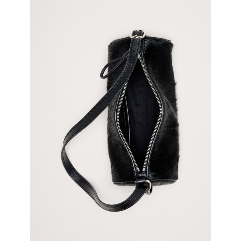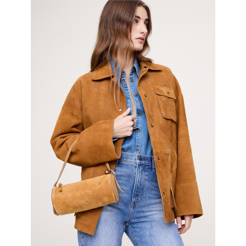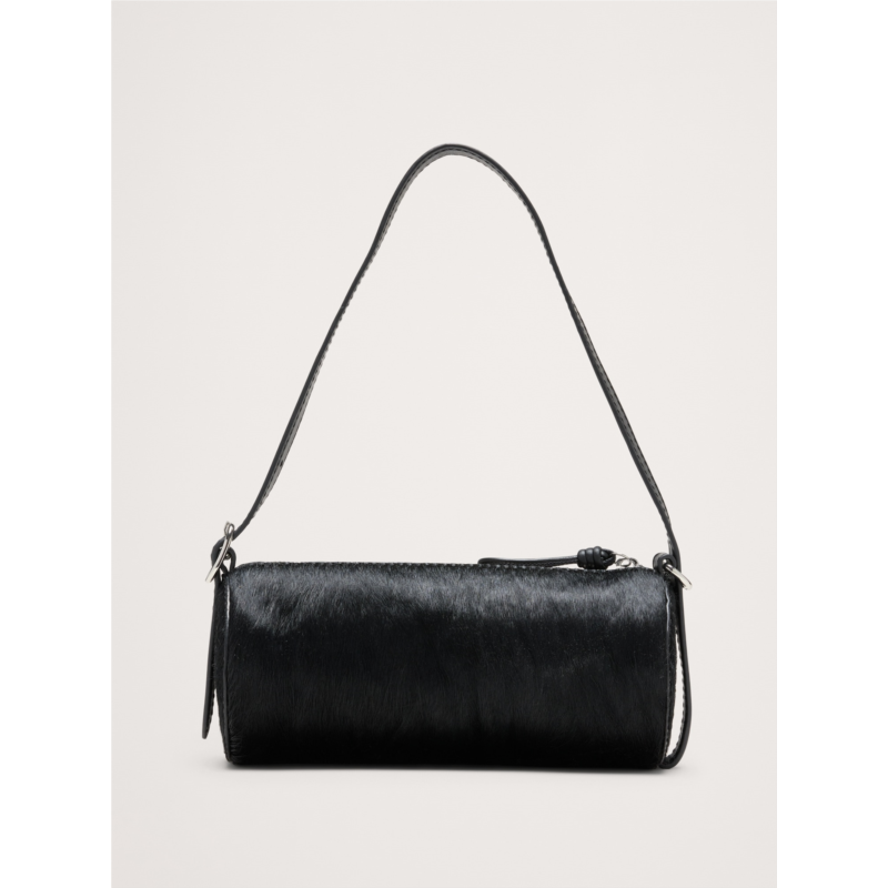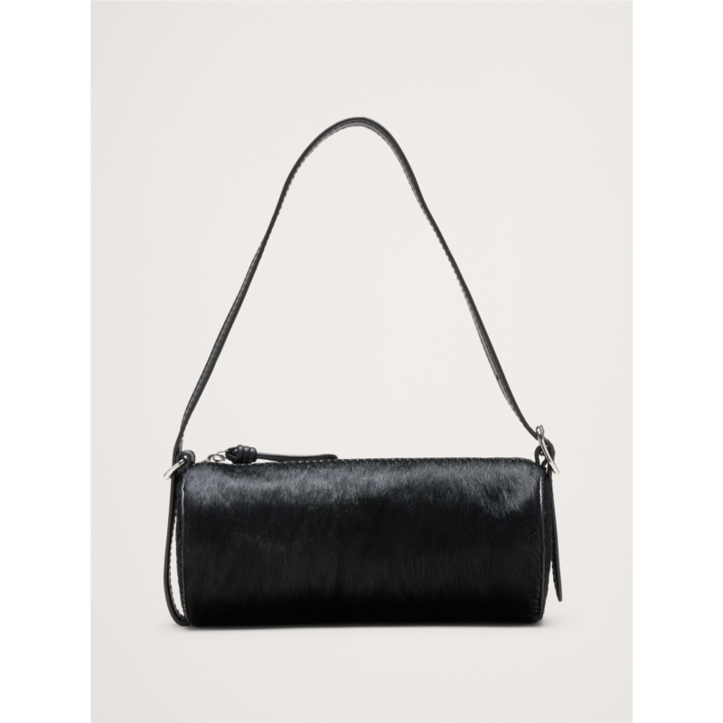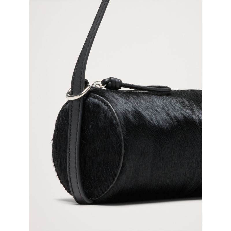 - Our take on the seasons barrel bag, we cut this one in your choice of luxe haircalf leather (also known as pony) or beautiful suede. We constructed the strap so you can carry it on your shoulder, or also like a top-handle bag.