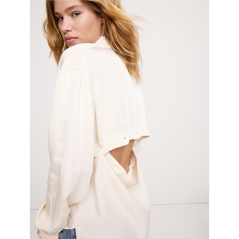 - A fresh take on the classic button-down, we cut this tunic with a button placket across the back shoulders so you can wear it closed or open for a peek-a-boo effect. Crafted in a drapey shirting fabric we love for its beautiful drape and softness.