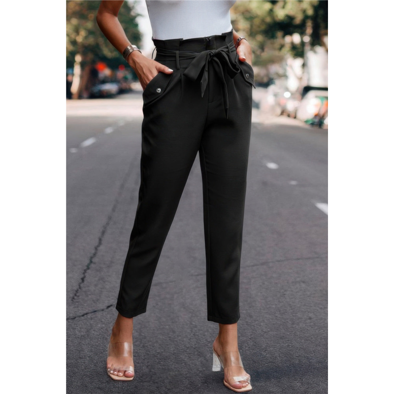 These Ruffle Belt Pocket Solid Skinny Pants bring a feminine edge to your daily wardrobe. The ruffled waistband and belted tie accent the high-rise cut, while functional pockets and a slim fit keep the look polished and practical.