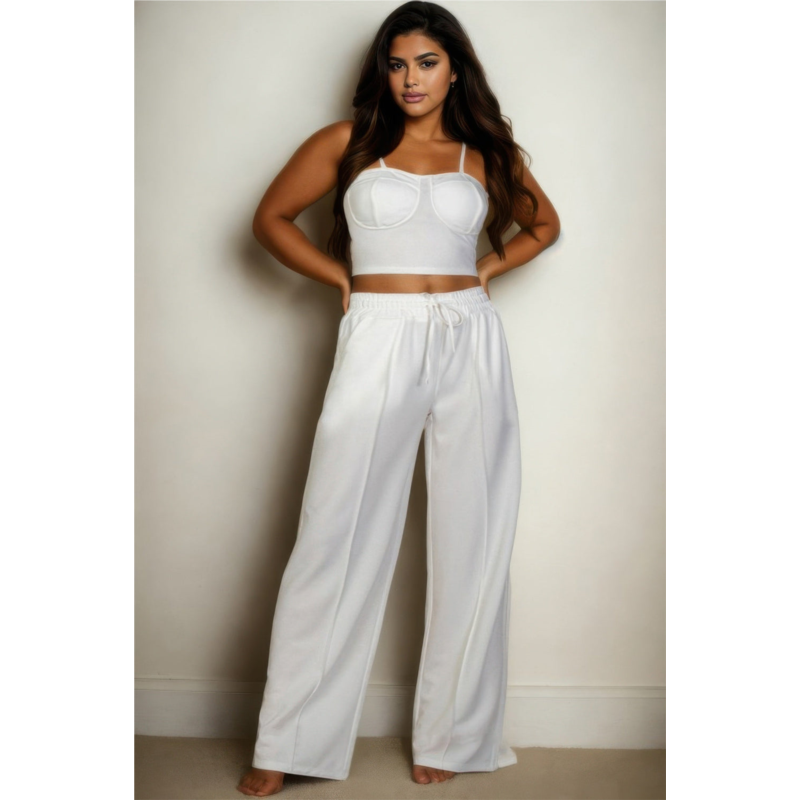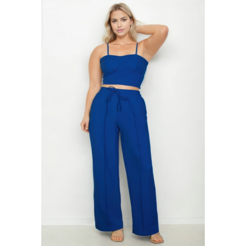 Designed to flatter and function, this Plus Size Bustier Crop Cami Top & Straight Pants Set delivers sleek style with everyday comfort. The structured crop top contours beautifully, while the high-waisted pants offer a relaxed straight-leg fit with an adjustable elastic waistband. Functional slant pockets add convenience, making this set both stylish and practical. Whether dressed up or kept casual, it''s your new go-to for effortless outfit coordination.