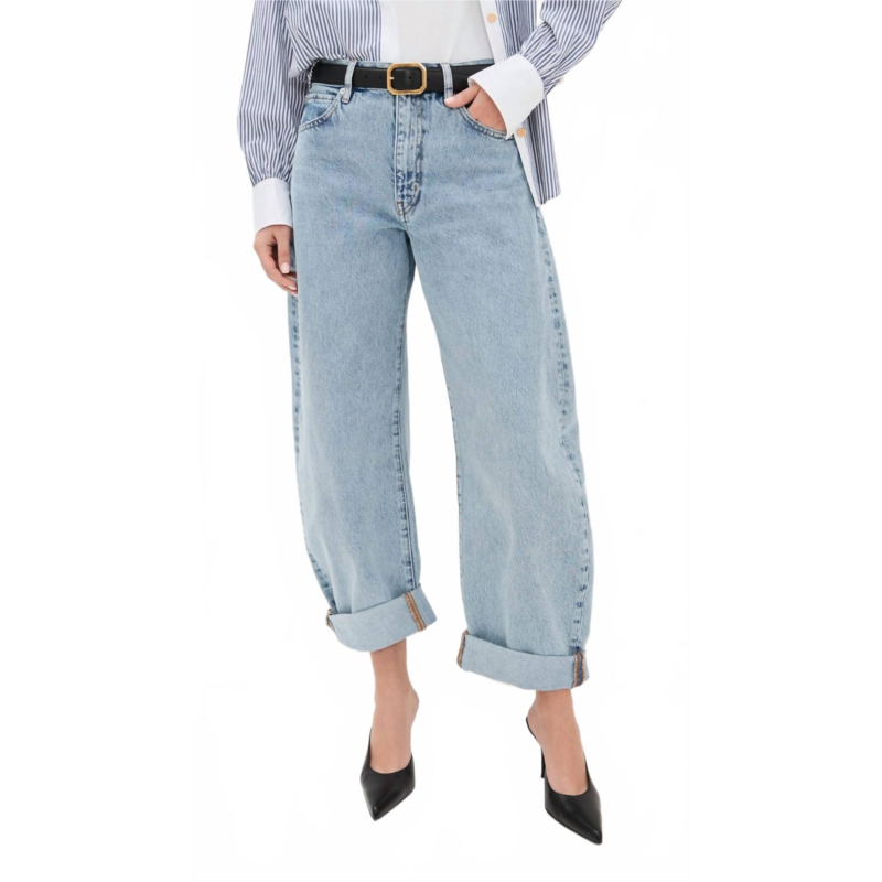 Pair these straight leg jeans with flats, sandals or even heels! You can''t go wrong.Introducing the Bubble Jeans by FRAME, an innovative twist on the barrel silhouette in a striking Outlaw hue. Crafted from luxury denim, these mid-rise jeans offer a relaxed boyfriend fit, featuring a 12.25'' front rise and a playful curved outseam for a unique bubble effect. Designed to be worn cuffed at the ankle with a 2.5'' twice-rolled hem, the jeans have a 26'' cuffed inseam, extendable to a dramatic 31'' when unrolled. Made from 100% premium regenerative cotton, these jeans include a zip fly and button closure with a five-pocket design, ensuring comfort and style. Machine wash cold for easy maintenance.