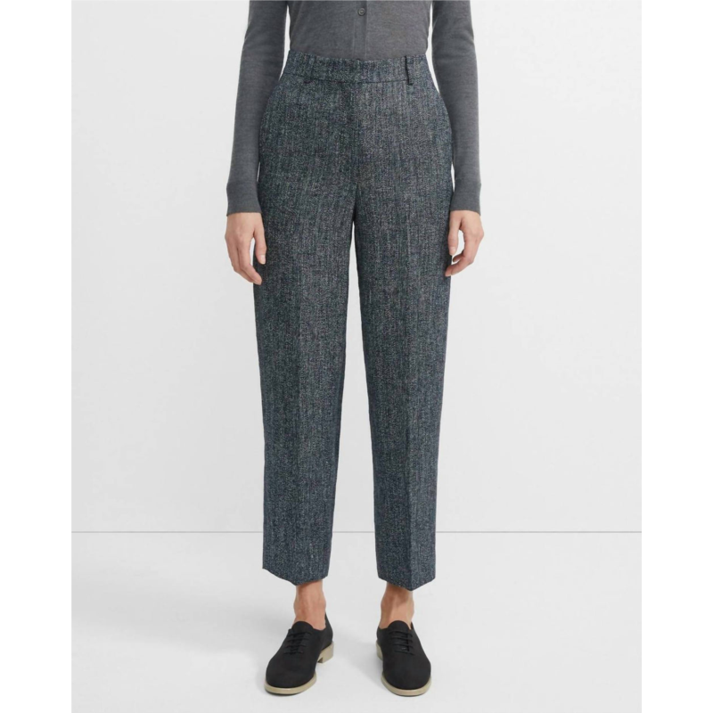 Stay on-trend and showcase your impeccable taste with these adaptable and stylish cropped pants. The perfect length to wear with your favorite mules. Youll love the fit!Elevate your career wardrobe with the High Waist Straight Ankle Crop Career Pants by Theory. These ankle-length pants feature a high-rise waist and a straight leg, providing a sophisticated silhouette that pairs perfectly with on-seam pockets and belt loops for added functionality. Crafted in Italy, they boast a luxurious 62% Linen and 38% Viscose herringbone-textured blend, ensuring both comfort and style. With a 26.5 inseam and a sleek black and white color scheme, these pants epitomize premium European tailoring. Care for this exquisite piece is easy with dry clean maintenance.