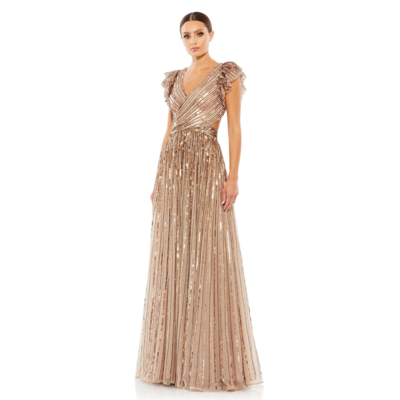 [US] Mac Duggal sequined cut out ruffled cap sleeve lace up gown