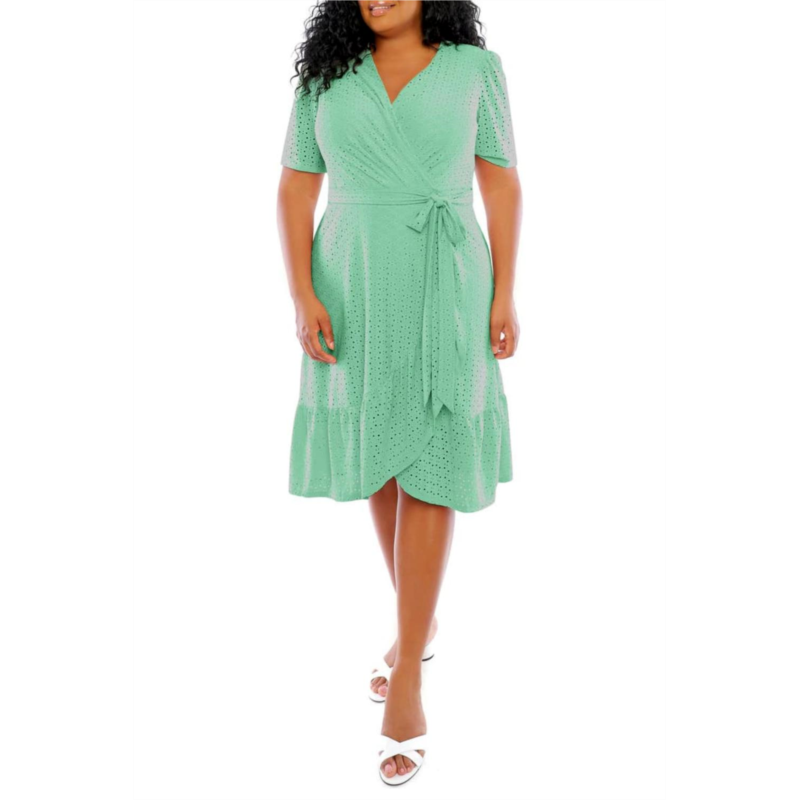 Just add slides or mules and you are good to go.The Short Sleeve Faux Wrap Midi Dress by London Times in Absinthe Green is ideal for a summer vacation. This women''s fit and flare dress features short sleeves, a V-neckline, and a textured eyelet jersey made of 93% Polyester and 7% Spandex, lined with 100% Polyester. It includes a tie closure for a flattering fit, complemented by a surplice neckline and frilly trim skirt. For easy maintenance, machine wash cold and enjoy effortless style with this minimalist wrap silhouette.