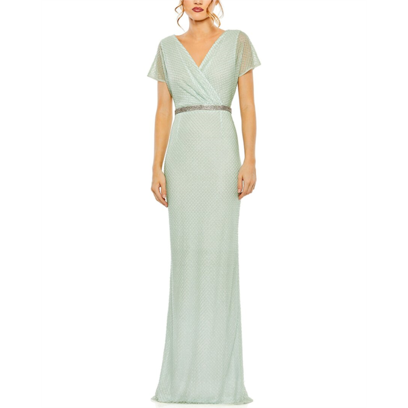 Elevate your evening look with the stunning Mac Duggal Beaded V-Neck Gown in Sage. This elegant gown features intricate beading, a flattering V-neckline, and cap sleeves for a touch of glamour. The closed back and long sleeves add sophistication, while the center back zipper closure ensures a secure fit. Made from 100% polyester, this gown is lined and has a built-in bra for added comfort and support. Perfect for formal events or elegant occasions, this imported gown measures approximately 60 inches from shoulder to hem. To care for this exquisite piece, simply spot clean and lay flat to dry. Make a statement in this timeless Mac Duggal gown.