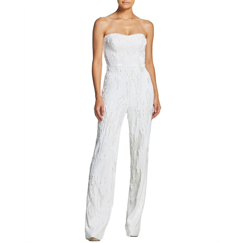 Introducing the Dress The Population Andy Jumpsuit - a stunning piece from the renowned brand known for beautifully crafted dresses in flattering silhouettes. This jumpsuit, in the color Lily, features a 32.5-inch inseam and a 12.25-inch rise for a comfortable fit. It also includes a center back zipper for easy wear, and is adorned with 5mm slip sequins for a touch of glamour. The jumpsuit is lined with ITY lining and can be easily hand washed. Imported for your convenience, this jumpsuit is perfect for any special occasion.