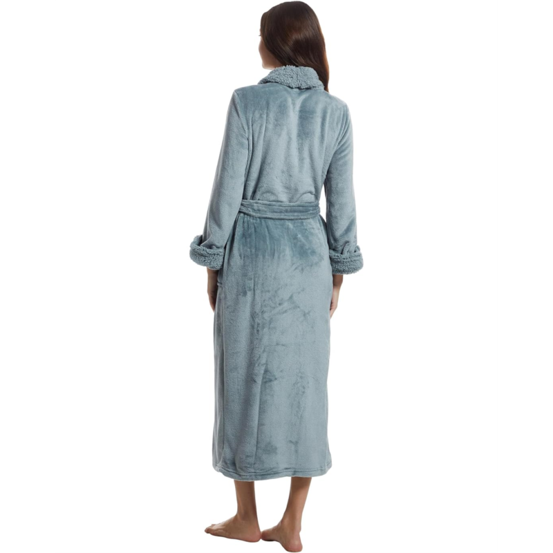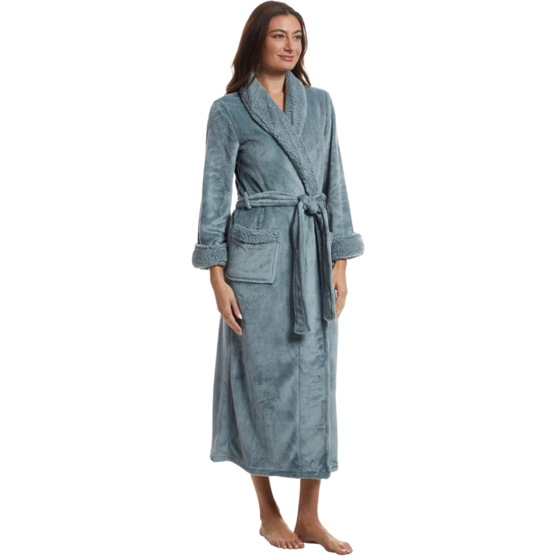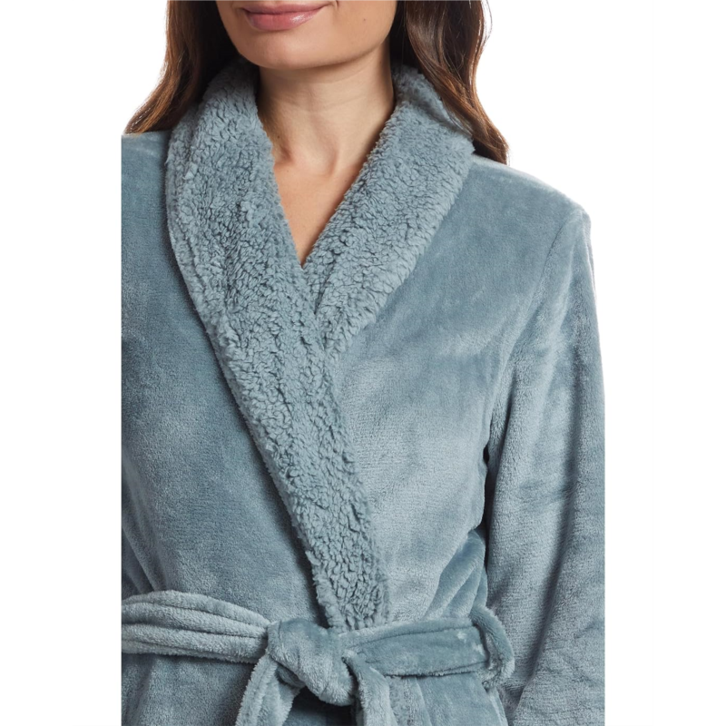 Soft fine knit polyester with contrast sherpa trim at the inside shawl collar.
