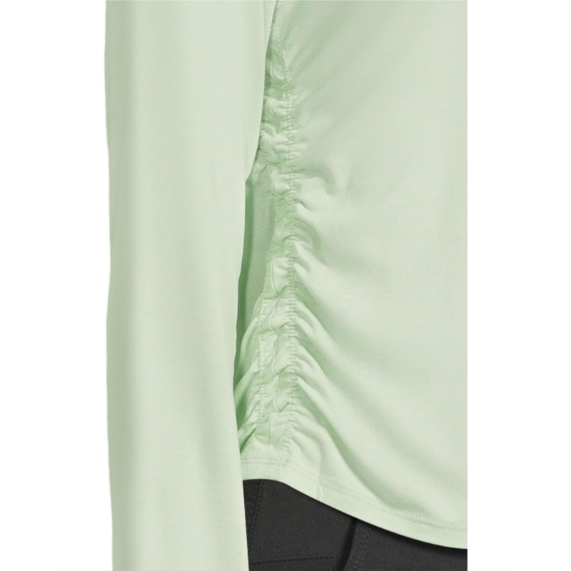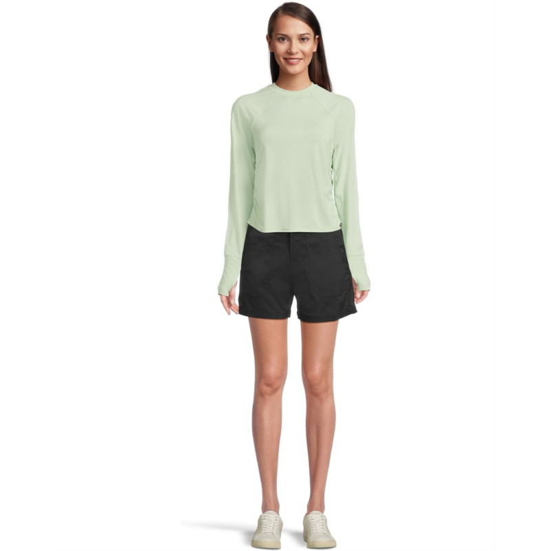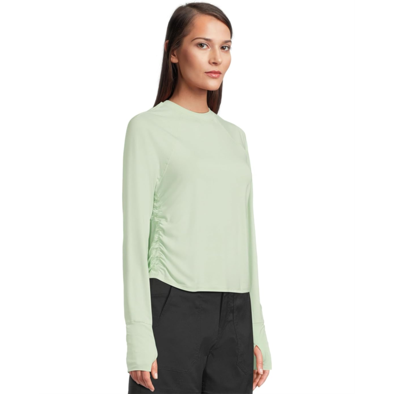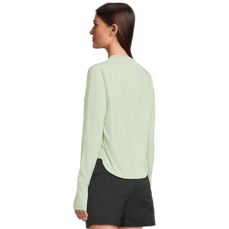 Slay the casual style game wearing the Prana Sol Searcher LS Crew Top with your favorite pair of jeans. The pull-on style top features a crew neckline, long sleeves with thumbholes, gathered side seams, and a cropped body with prAna logo at right hem.
