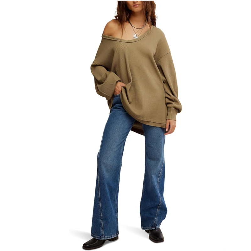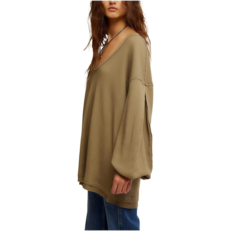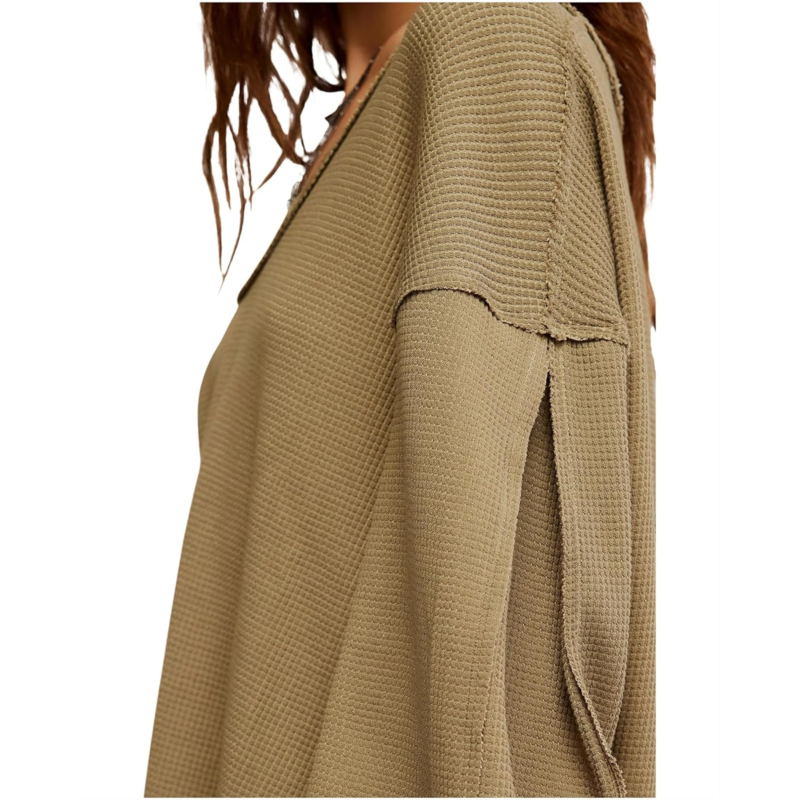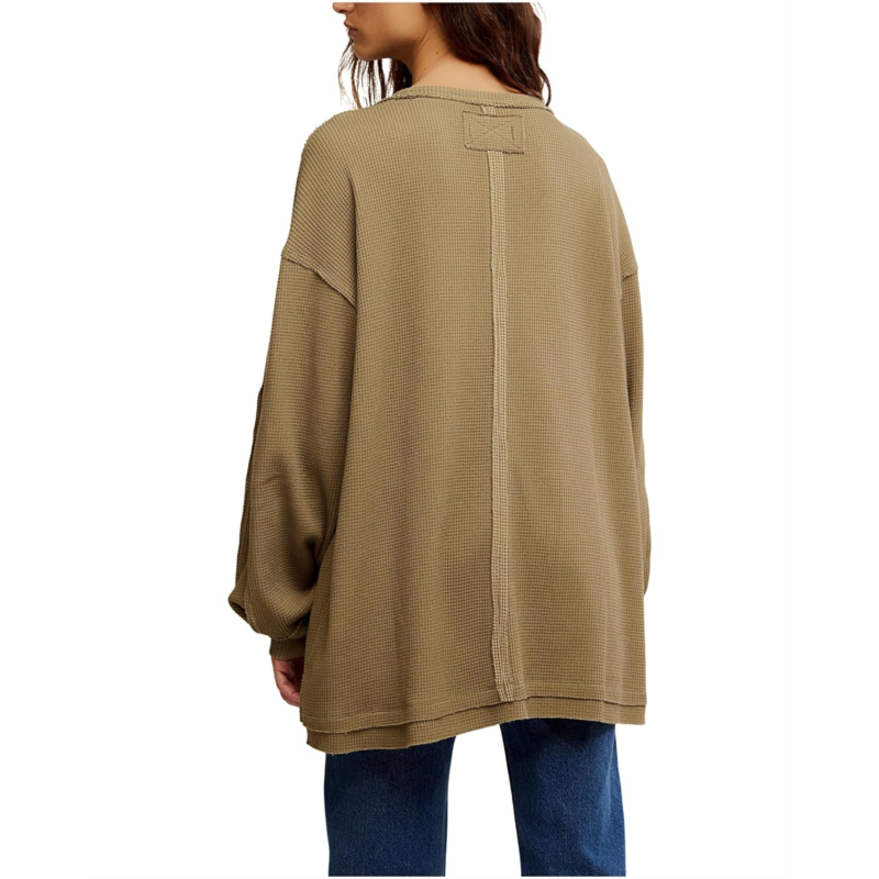 Experience comfortable and cozy vibes wearing the Free People Coast 2 Coast Thermal Sweatshirt, crafted in an oversized, longline fit. The sweatshirt features a V-neckline, dropped shoulders, long sleeves with ribbed cuffs, and a straight hem.