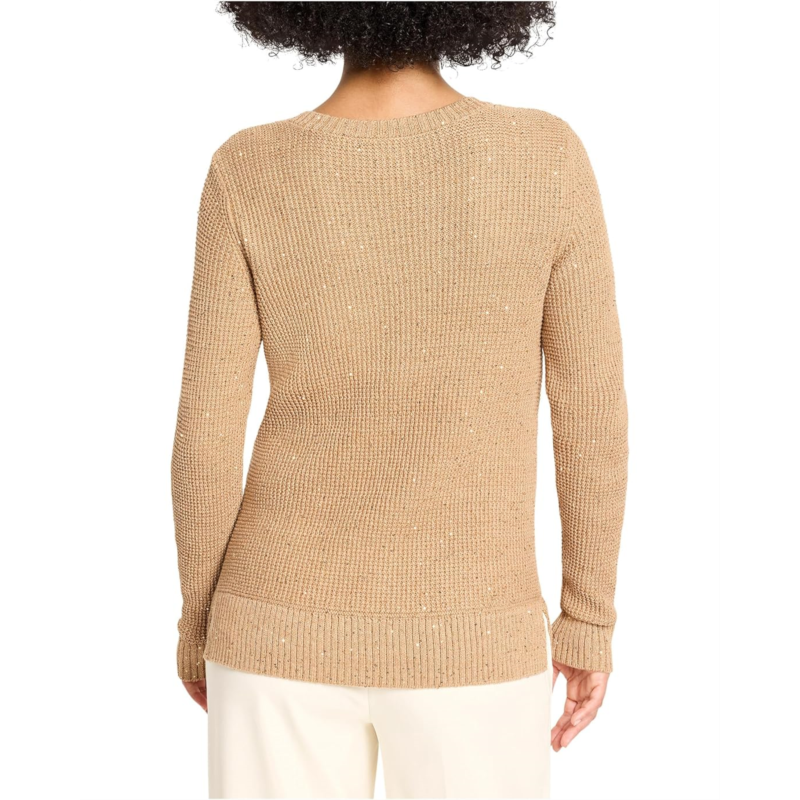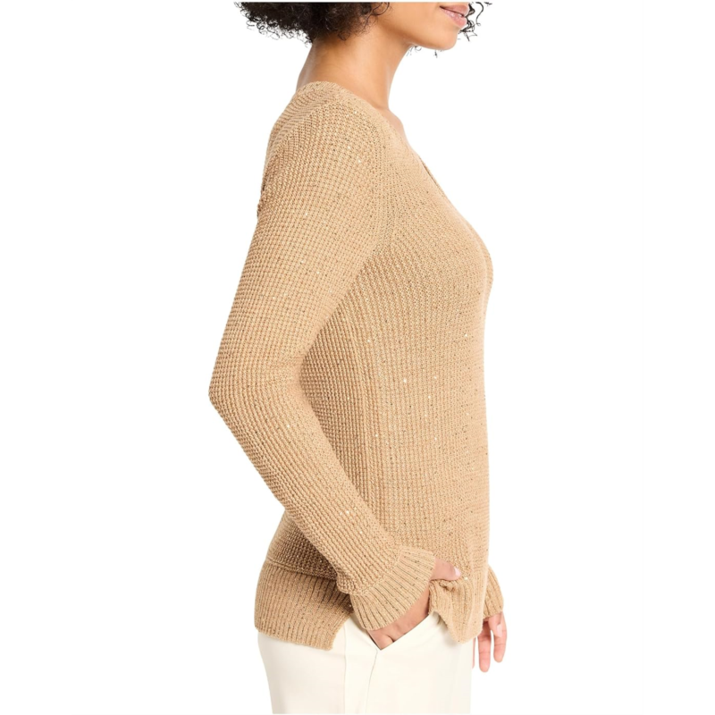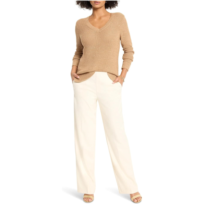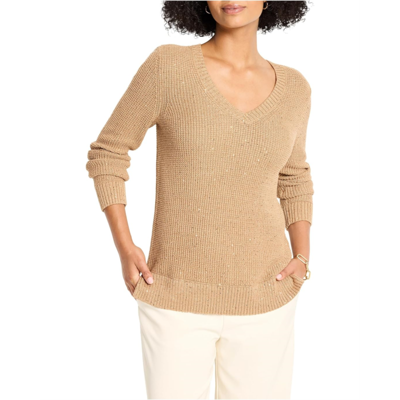 Elevate your daytime (and anytime) wear with this NIC+ZOE Shimmer Waffle V-neck Sweater featuring a layer of lurex and sequins spun into the yarn for an added shimmer. Its classic V-neckline is easy to layer with drape, softness, and just the right amount of stretch. This textured pullover sweater is styled with long sleeves and a straight hem.