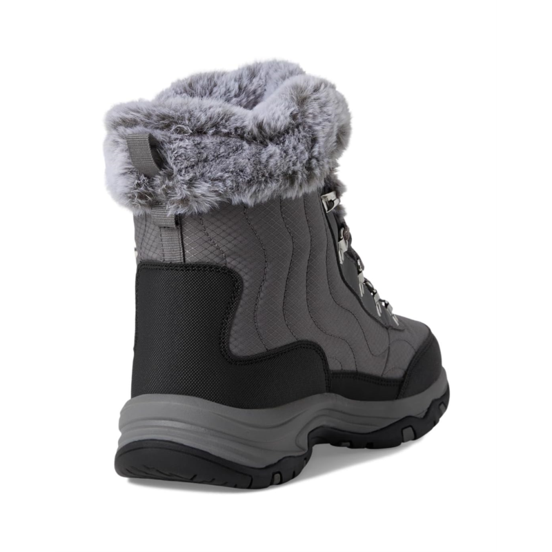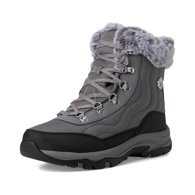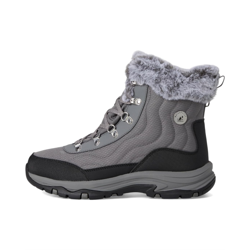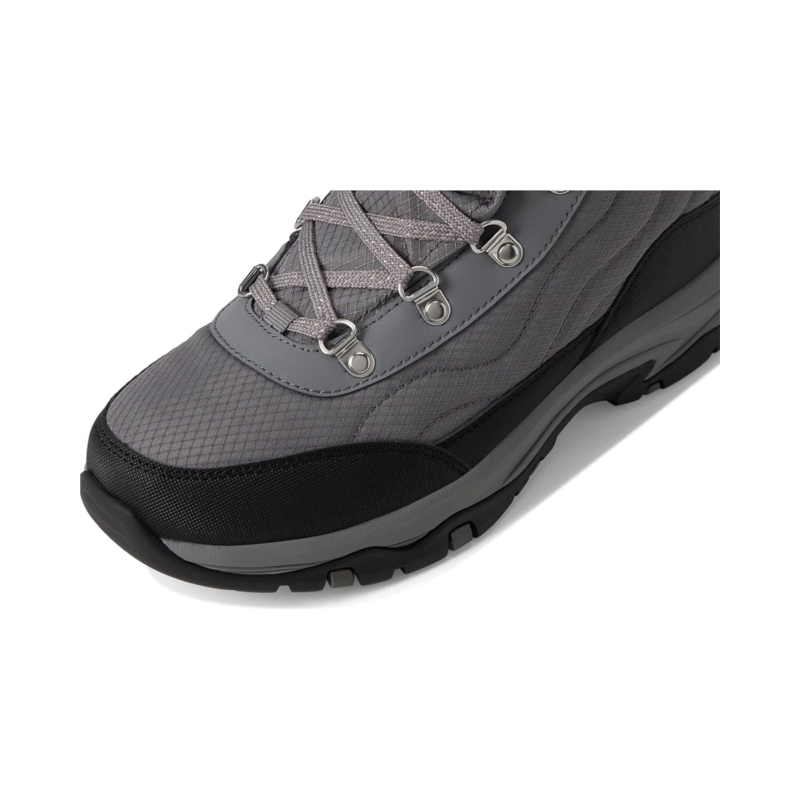 Keep it cozy this season in rugged comfort wearing the SKECHERS Trego - Stormie. The lace-up hiking boots feature waterproof synthetic and mesh upper, faux-fur lined trim and Skechers Air-Cooled Memory Foam cushioned comfort insole. The ankle-high shoes have fabric lining, waterproof seam-sealed design, and round toe design.