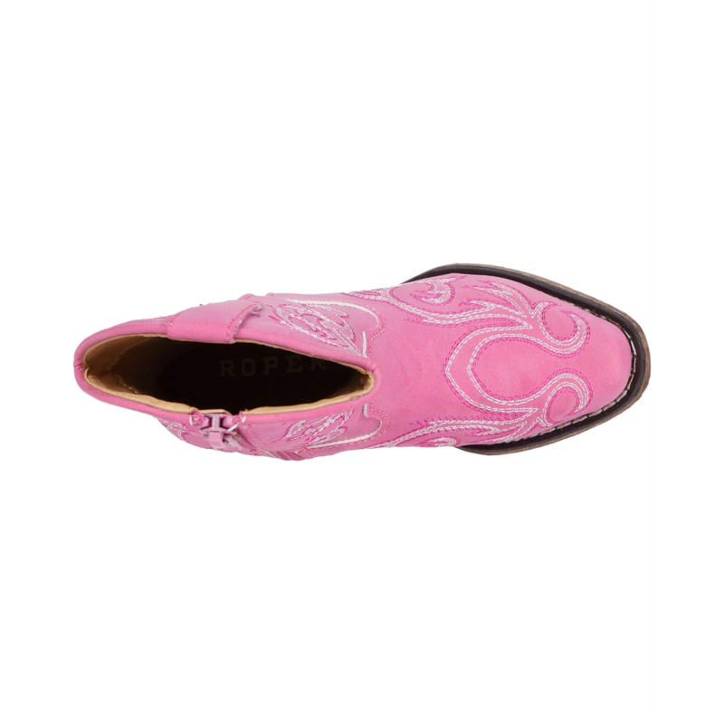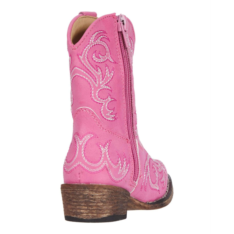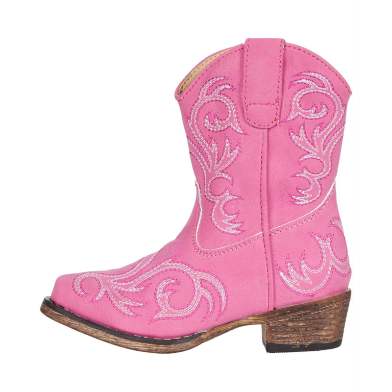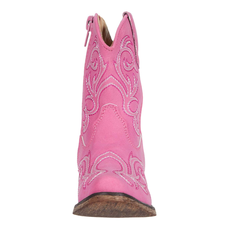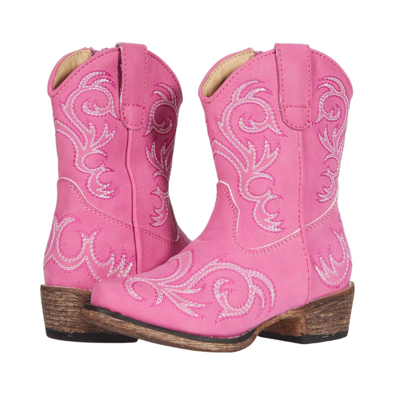 Let her shine with stylish flair in the beautiful Roper Kids Riley boots. Tall western boots designed in a synthetic upper featuring a contrast stitching throughout.