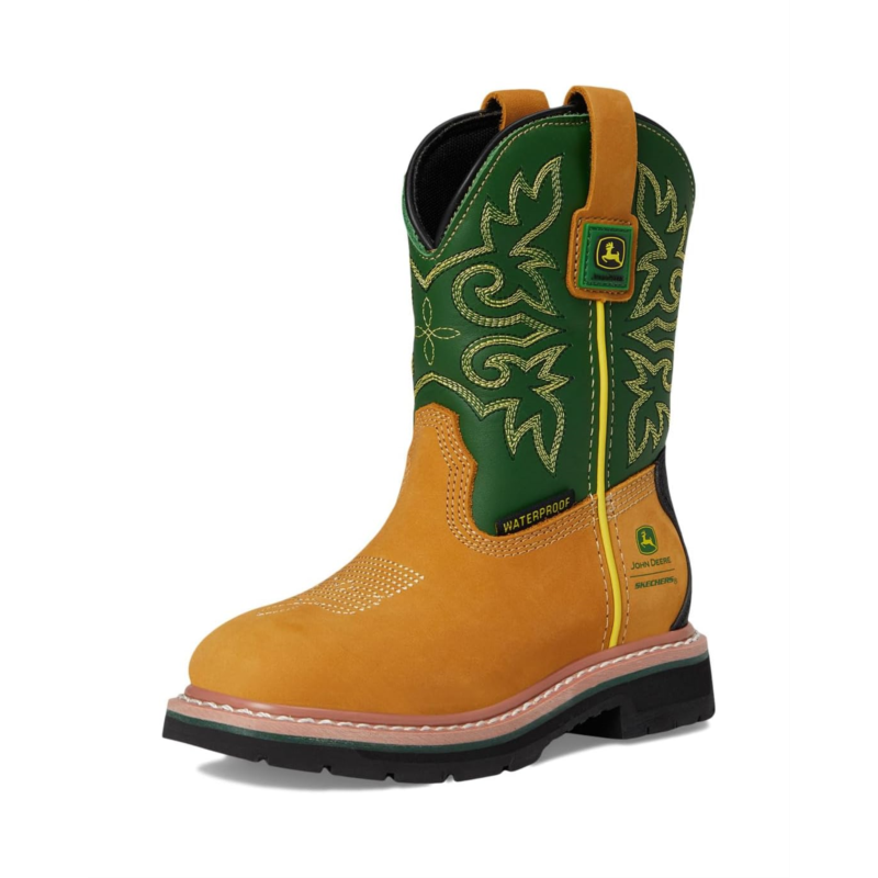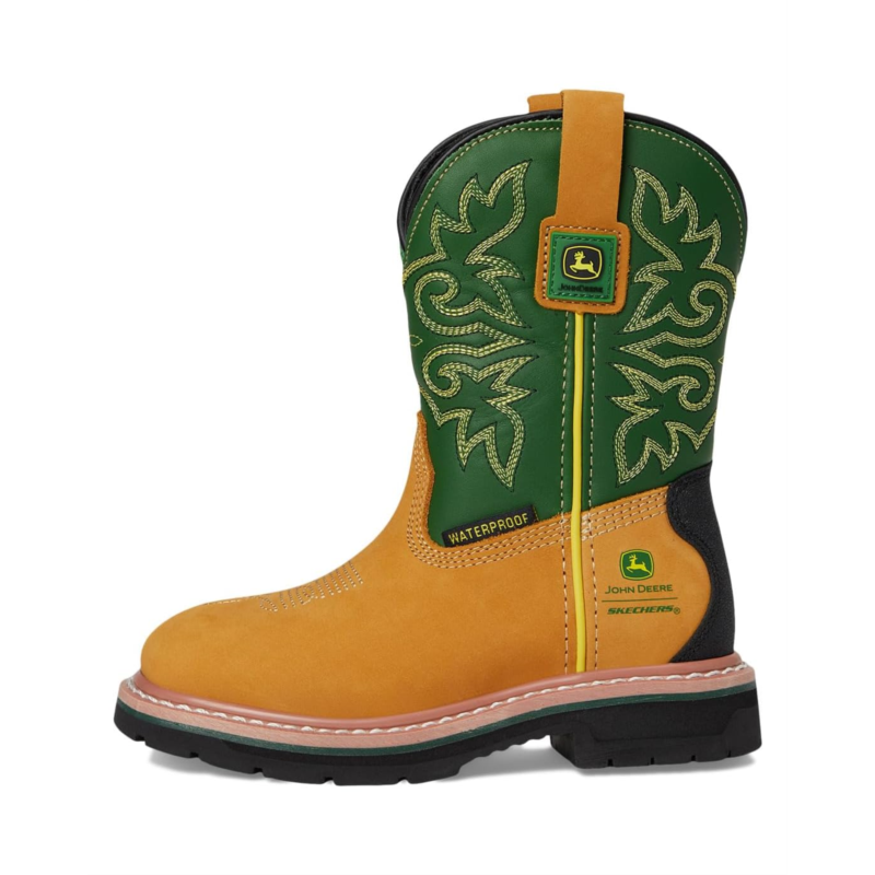 Get your kid ready for outdoor adventures wearing the SKECHERS KIDS X John Deere-rowood - Boulder Valley 407050L boots. These waterproof work boots feature a durable Goodyear welt construction, leather upper with embroidered detail and a John Deere tractor charm, and a cushioned Skechers Air-Cooled Memory Foam insole. Their seam-sealed waterproof design keeps your kid''s feet dry, while the cotton lining provides added comfort. For youngsters dreaming of driving a tractor someday, these pull-on boots have arrived. Your little one can ''work'' alongside you in total comfort thanks to these fun mini-you styles.