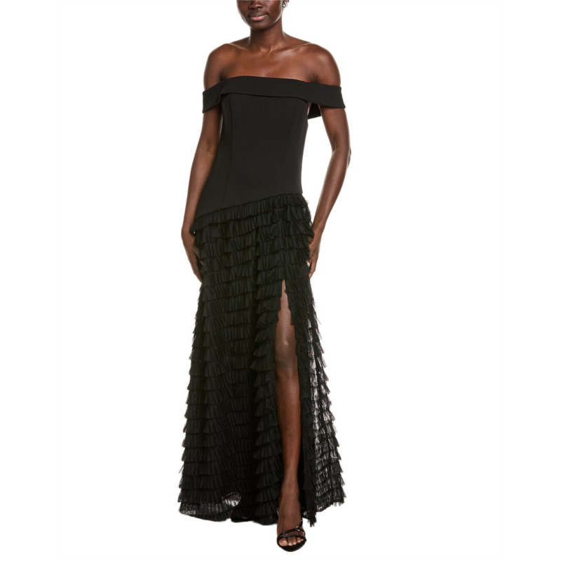 Elevate your eveningwear with the Aidan Mattox Tiered Tulle Frill Maxi Dress. This stunning off-the-shoulder dress features a tiered tulle skirt that flows beautifully, making you feel like a true princess. The elegant black color adds a touch of sophistication, while the center-back zipper with hook-and-eye closure ensures a secure fit. Made from high-quality materials, this dress is both comfortable and stylish. Pair it with your favorite heels and statement jewelry for a glamorous look. Dry clean only. Imported.