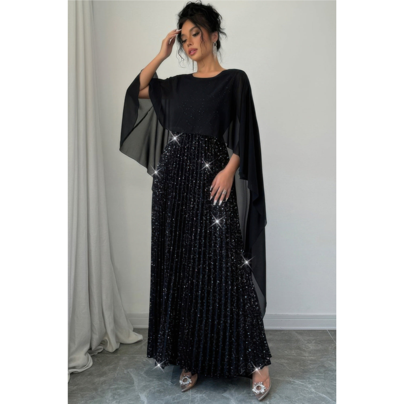 The Elegant Sequin Satin Knit Pleated Long Dress brings together sophisticated design and everyday comfort. Featuring shimmering sequin accents and a pleated silhouette, this long satin knit dress creates an effortlessly elegant look suitable for various occasions. Made from a soft blend of polyester and elastane, it ensures breathability, flexibility, and a flattering fit. Whether worn casually or dressed up with accessories, this versatile piece is ideal for events ranging from casual outings to more refined gatherings.