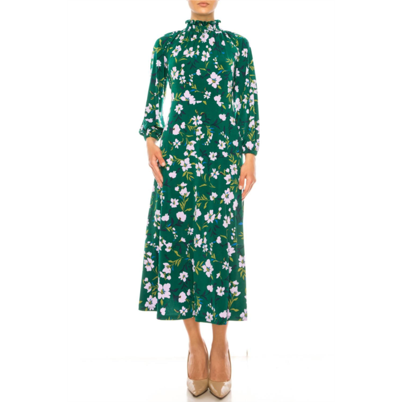 The perfect length dress does exist.Presenting the Floral Mock Neck Midi Dress by Maggy London, a vintagekorea piece in a charming Green Lilac floral pattern perfect for a spring dinner party or Mother''s Day celebration. This midi dress features long balloon cuff sleeves, a smocked mock neckline, and a flowy A-line silhouette, ensuring feminine elegance. Composition - Jersey (95% Polyester, 5% Spandex). Closure - Hidden back zip for a seamless look. Care - Machine wash cold.