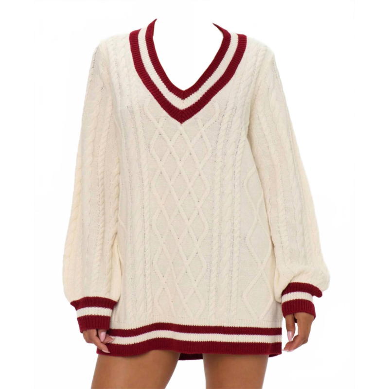 A short and breezy dress for those warmer days.Embrace cozy style with the Women''s Varsity Sweater Dress by Show Me Your Mumu, a perfect fall piece in a textured knit. Featuring long sleeves and crafted in a shift silhouette with a V-neckline, this mini dress showcases burgdy and cream stripes for a classic collegiate touch. Made from knit material and designed for a relaxed, oversized fit, it is ideal as a dress or tunic hitting mid-thigh, perfect for vacation or streetwear occasions. Closure - Pull-on. Care instructions - Machine wash and lay flat to dry.