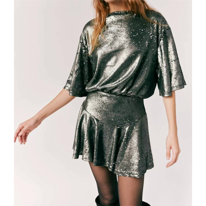 The perfect mini dress for those warmer months.This silver top features a crew neck, short sleeves, and an allover sequin design. Made from 100% nylon. Hand wash only.