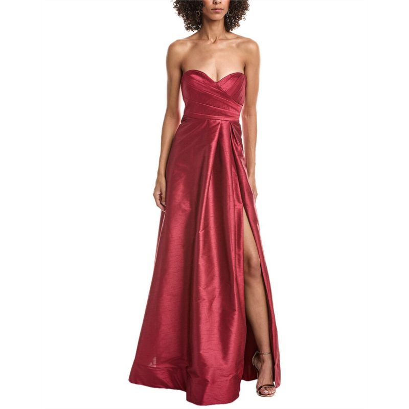 Introducing the ''LIKELY Kayla Gown'' in Rumba Red. This stunning gown features a sweetheart neckline, pleated front, and side slit, offering a sleek and sophisticated look for any special occasion. With a center back zip and hook-and-eye closure, this gown is easy to put on and off. Made from 100% polyester with a lining of 88% polyester and 12% spandex, this gown is both comfortable and stylish. Standing at approximately 54 inches from shoulder to hem, this gown is perfect for taller women, like our 5''11'' model who is wearing a size 6. Please note that measurements may vary slightly by size. Designed for dry clean only and imported for your convenience. Elevate your wardrobe with the ''LIKELY Kayla Gown'' and make a lasting impression at your next event.