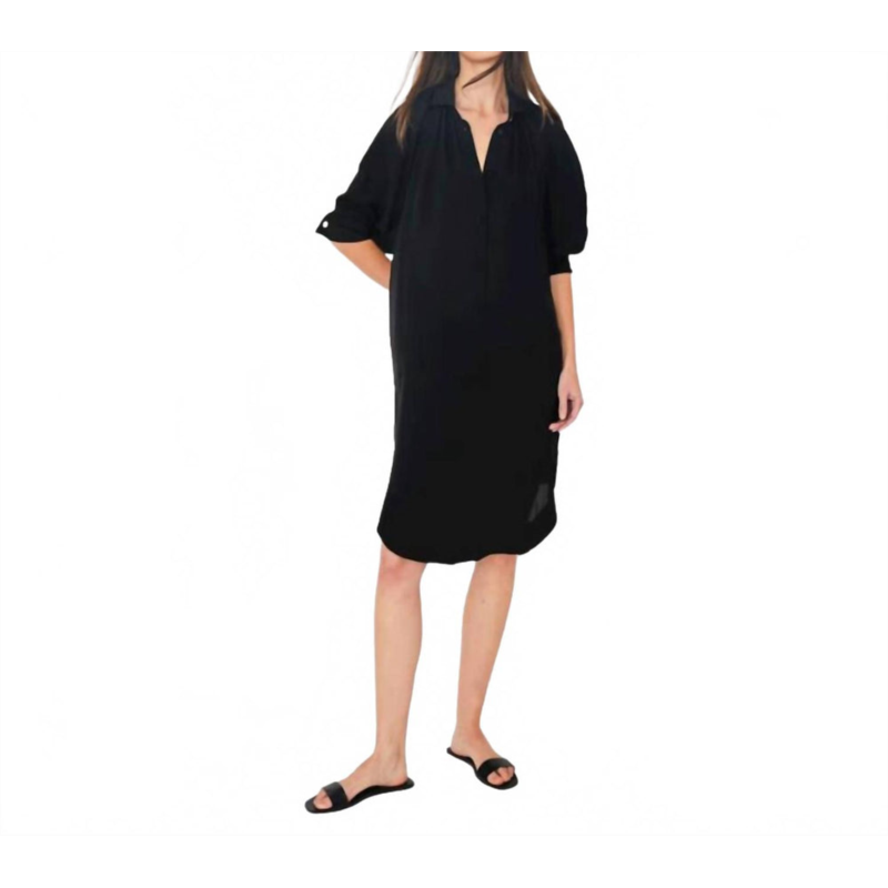 Comfortable and cute, this casual day dress has it all.Step seamlessly from day to night in classic black. Solid-patterned dress boasts raglan long sleeves and a relaxed shift silhouette with a V-neckline. Made from 100% silk. Features a curved shirt tail hem and a convenient 3/4 button front placket. Care instructions include dry clean only, offering a chic yet practical choice for travel or gallery outings.